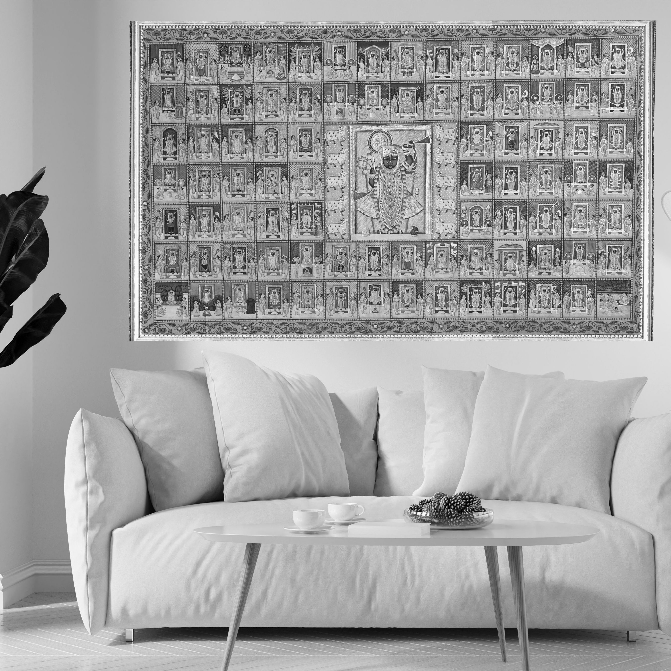 The artist’s vision for the 84 Darshan painting is to create an expansive visual anthology that honors the endless variety of Lord Shrinathji's divine appearances. The core intention is to demonstrate that no two moments of devotion are identical; each of the 84 depictions is unique, featuring distinct background colors, varied floral arrangements such as the lotuses held in the deity's hands, and intricate, non-repeating designs for the ceremonial garlands (Maalas).
