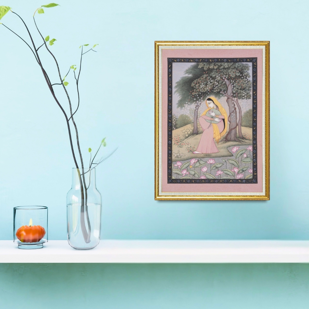 In this exquisite miniature, Mahaveer Swami draws upon classical Mughal sensibilities, translating them into a vision of poetic stillness. His delicate brushwork, fine use of line, and radiant balance of tone embody both artistic mastery and spiritual depth. The result is a painting that invites quiet contemplation—a gentle dialogue between the divine and the human heart.