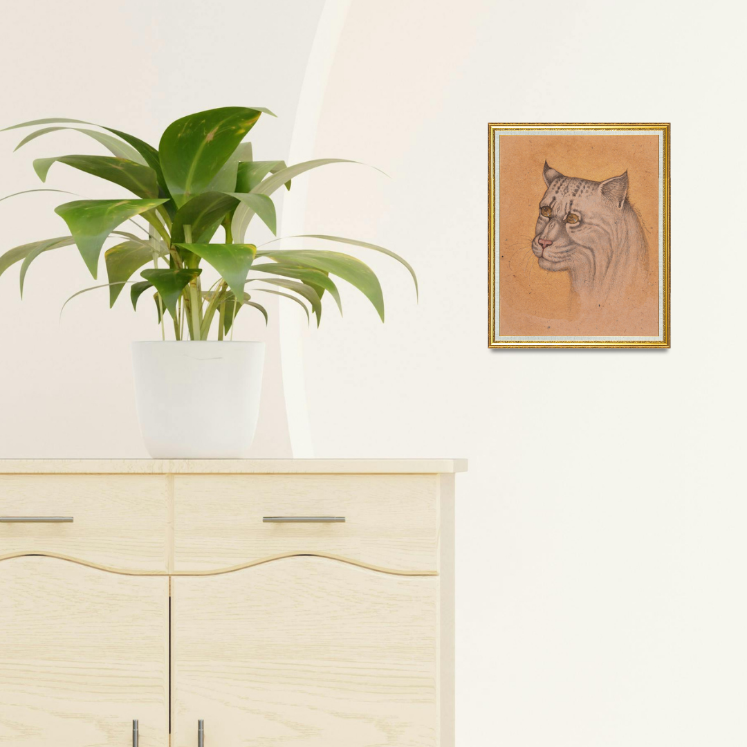 The pink nose and delicate whiskers add small but expressive details that enhance the natural realism of the miniature. The warm tone of the old handmade paper enriches the portrait, helping the fine ink work stand out with clarity. The overall expression of the wild cat feels steady and composed, defined by patient technique and understated elegance.