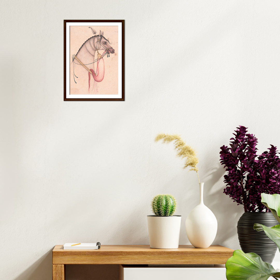 The old handmade paper lends a warm, organic surface that enhances the smooth shading across the horse’s form. The controlled use of natural black ink creates clear contours while allowing subtle tonal transitions to shape the expression.