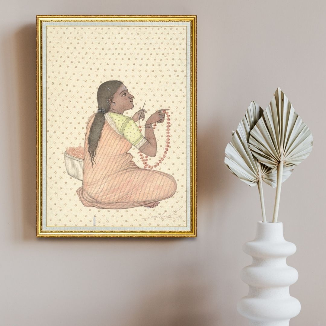 Garland Maker is a warm little scene that feels honest and close to everyday life. Mahaveer Swami paints the woman with a soft realism… seated comfortably, sari falling in gentle folds and hands moving with quiet skill as she threads each flower. The light pattern on the background keeps the mood soft and playful, almost like a textile behind her.