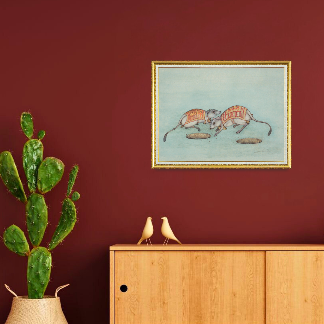 Grace of the Divine Kaba Pair presents a serene moment where two sacred rats move toward offering trays placed gently before them. Mahaveer Swami paints their bodies with smooth, subtle shading that highlights the delicate shape of their paws, faces and tails. Their ornate garments are filled with patterned gold-lined designs that stand out against the soft pale background, giving the scene a ceremonial presence. The small bells and tassels around their necks add charm and refinement to their sacred character.