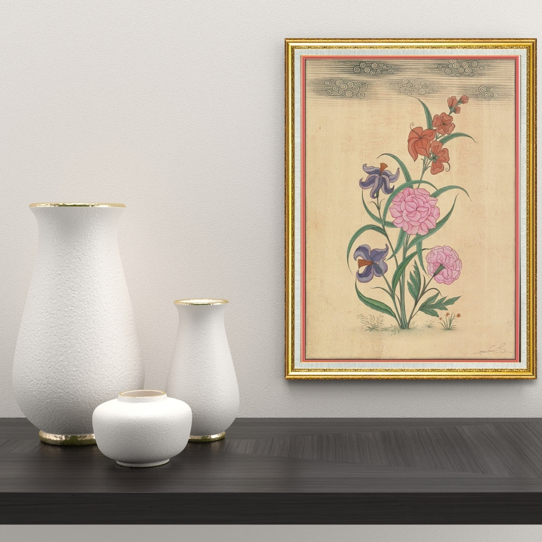 Harmony in Bloom celebrates the refined lyricism of Mughal botanical painting. Rising elegantly from a slender stem, blossoms of coral, lilac, violet and blush pink unfold in rhythmic balance. Each curve of petal and leaf reveals the artist’s precise observation of nature, rendered through soft brushwork and the luminosity of pure gold.