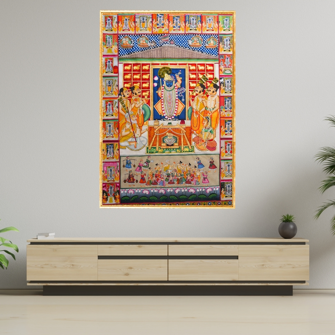 Above this tender scene, the artist has placed the majestic form of Shrinathji, reinforcing the belief that Shrinathji is indeed a manifestation of Lord Krishna himself. To provide a complete spiritual experience, the composition is framed by the 24 Darshans, a traditional element included in such paintings to allow devotees to witness the various other divine forms and manifestations of the Lord alongside his primary image.