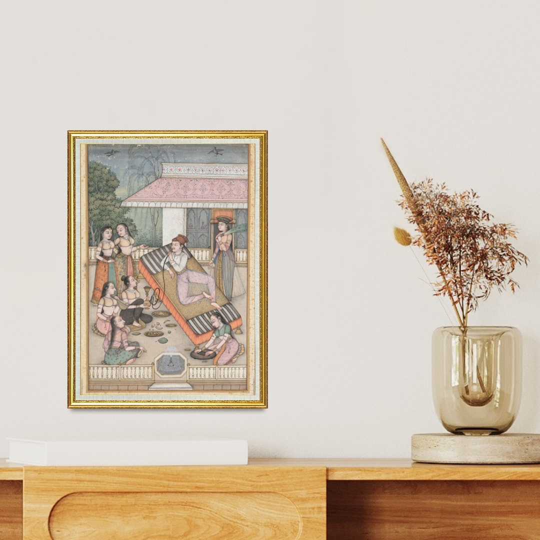 Swami’s miniature style brings every fabric fold and gesture to life. The pastel palette, paired with soft gold accents, creates a calm and elegant atmosphere. The artwork feels like a window into a private world where time moves slowly and pleasure is savoured with grace.