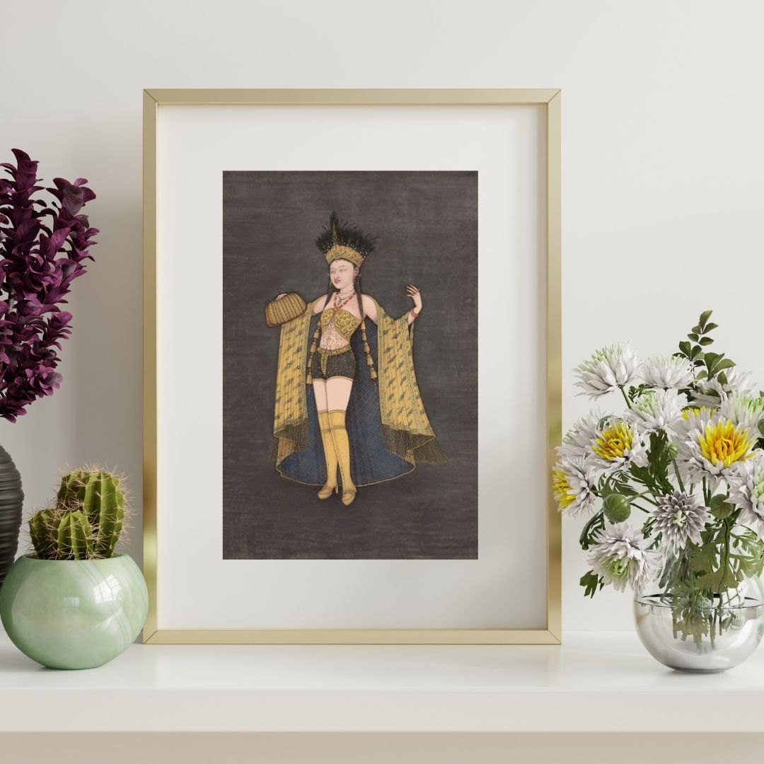 Golden Stage Dancer feels bold, theatrical and full of personality. Mahaveer Swami paints the figure with a mix of confidence and grace… a performer caught mid-pose, eyes gently closed as if letting the rhythm move through her. The gold-toned costume steals the spotlight… embroidered bodice, patterned shorts, tall stockings and a sweeping cape lined in deep blue. Every texture is drawn with the artist’s signature precision, from the tassels on the cape to the delicate feathers of her headdress.