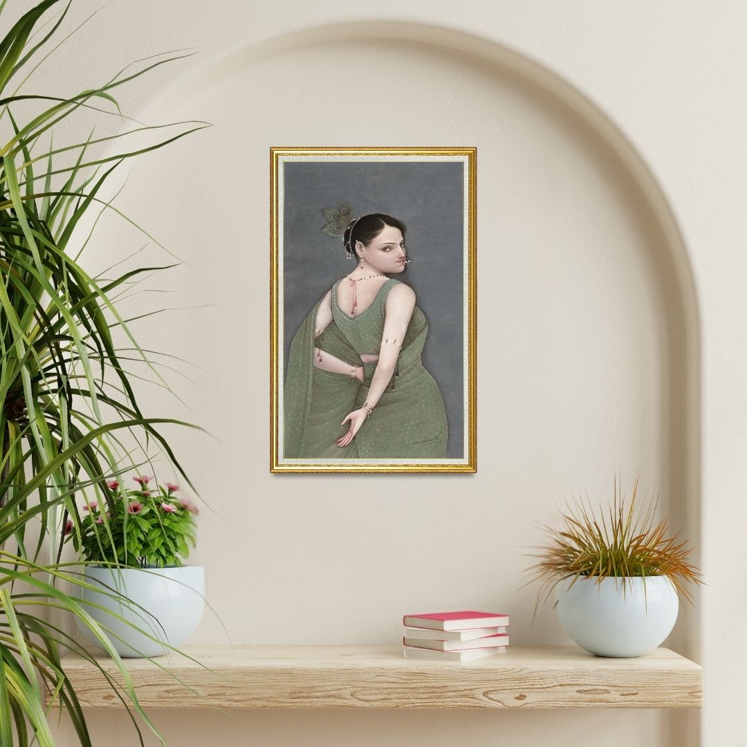 Whisper of the Green Veil captures a quiet moment loaded with attitude. Mahaveer Swami paints the figure as if she has just turned to look back… half curious, half amused, fully aware of her own presence. The soft green drape wraps around her with an easy flow, sprinkled with tiny dotted patterns that keep the eye moving. Her jewellery drops lightly along her neck, arms and back… delicate lines that add rhythm to the pose.