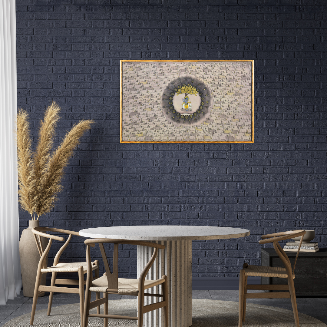Pichwai Painting – Krishna with Cows is a visual hush — the kind that settles over a landscape just before dawn. Krishna stands at the centre beneath a leafy tree, surrounded by soft grey cows that move in gentle unison. Around him, an intricate halo of peacock feathers opens like a quiet burst of radiance, drawing the eye naturally to the divine figure.