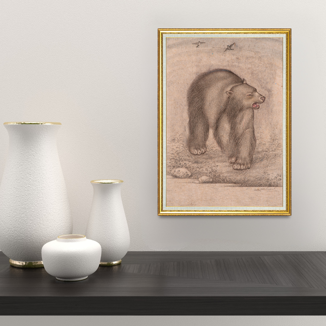 Quiet Roam of the Forest Bear feels like a slow breath in the wilderness that holds your attention without trying. Mahaveer Swami draws the bear with steady, confident lines that capture its weight and quiet power. The soft shading along the fur gives the body depth and texture, while the open mouth and lifted head create a gentle sense of alertness. Every stroke around the eyes, muzzle and paws brings out a calm, grounded presence that feels natural and unforced.