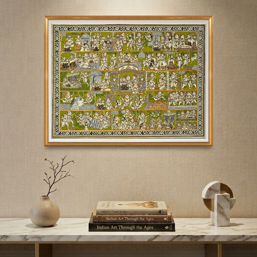 This green-themed Ramayan illustration captures the complete epic, starting from the Putrakameshti Yagya and the birth of the four princes. The narrative follows their education with Guru Vashistha, the slaying of Tadka, the redemption of Ahilya, and the Sita Swayamvar, leading into their exile and the abduction of Sita. Key sequences depict the battle with Bali, Hanuman's journey to Lanka, the burning of the city, the building of the Ram Setu, and the retrieval of the Sanjivani herb during the war. The artwork concludes with the defeat of Ravan and the return to Ayodhya, featuring the royal coronation (Pattabhishek) as the central focal point.