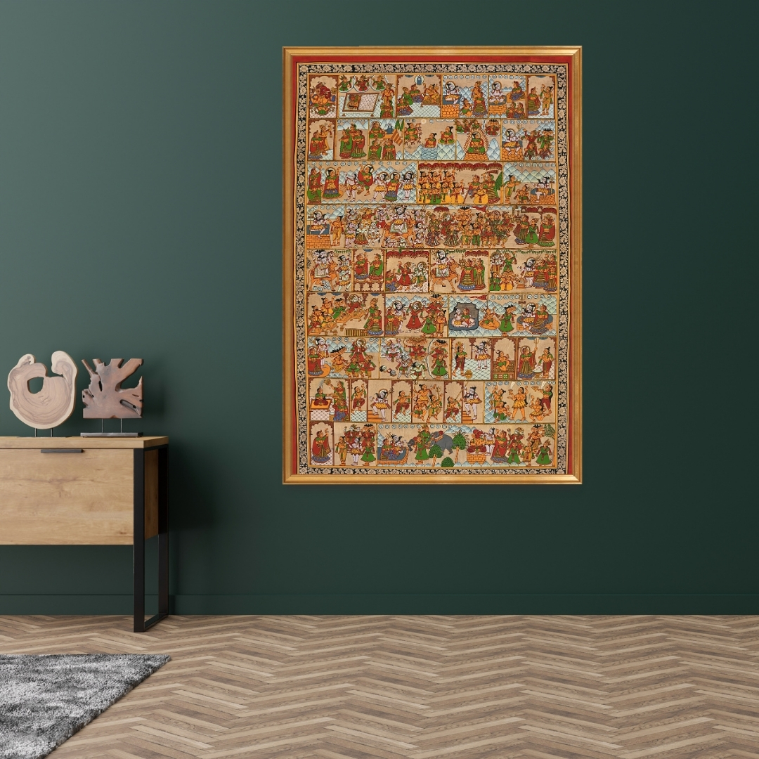 This artwork illustrates the Shiv Puran, focusing on Lord Shiva’s journey from his separation from Sati to his marriage with Parvati. It depicts Parvati’s birth, her intense penance to win Shiva, and the deities persuading Shiva to wed. The narrative includes the Saptarishis visiting King Himavan, the grand wedding procession, and Queen Maina’s welcome. It concludes with the birth of Ganesha, where Parvati creates him from clay, leading to Shiva’s intervention and Ganesha receiving an elephant’s head.