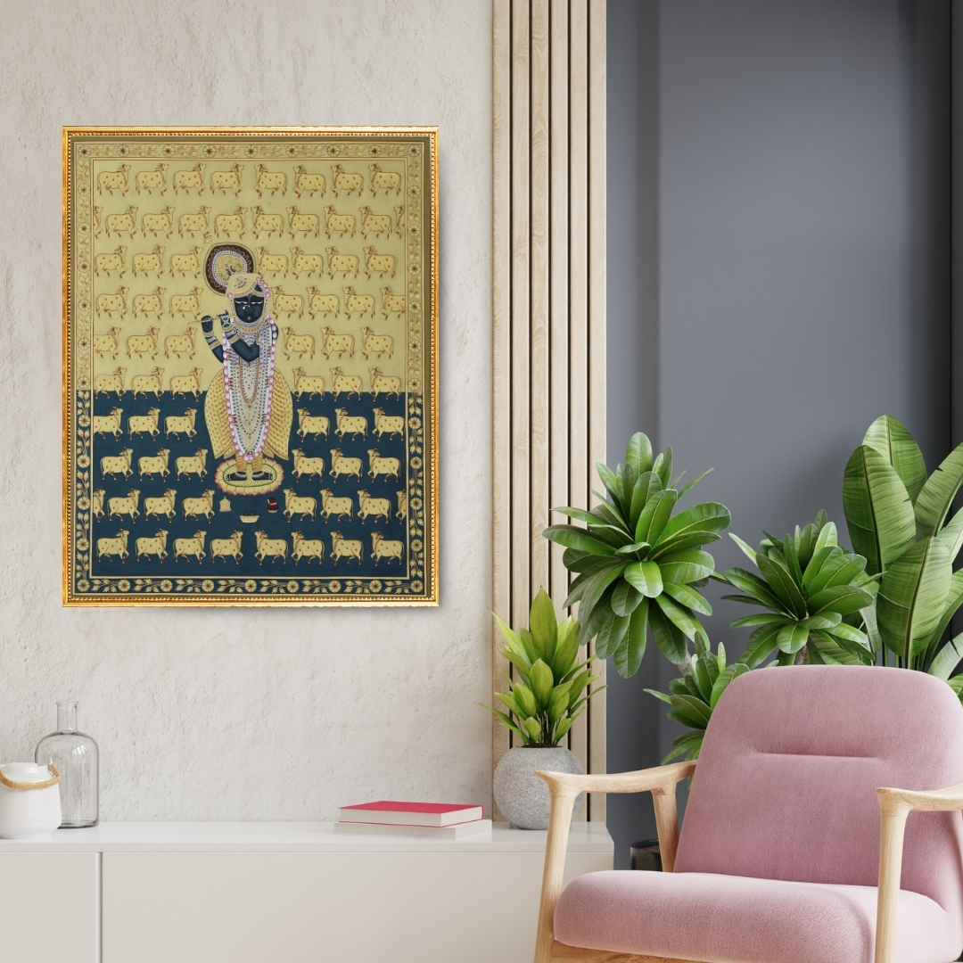 The patterned backdrop of cows is more than decorative—it honours Shrinathji as Govardhan Nath, protector of cattle and the pastoral world. Painted on cloth using mineral and fabric pigments, the artwork carries the luminous, matte richness characteristic of traditional Pichwai art. Gold-toned borders, repetitive motifs, and measured symmetry evoke the calm, disciplined atmosphere of a shrine wall. The piece merges devotional storytelling with dignified visual stillness, making it both spiritually resonant and visually refined.