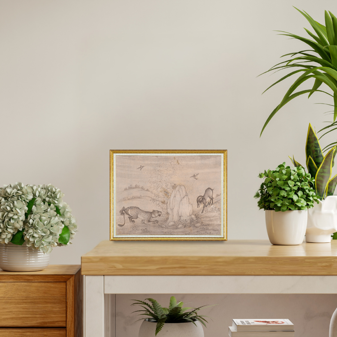 Stalk in the Quiet Hills shows a moment where stillness and alertness meet in perfect balance. Mahaveer Swami paints the cheetah low to the ground, its body curved in a patient crouch, ready to move yet held in complete control. The soft stippling along the fur gives the animal a gentle texture that contrasts with the smooth slopes of the surrounding landscape. Across the rocky rise, the mountain goat lowers its head as it steps carefully down the incline, unaware of the watcher beyond the tall stone formation.