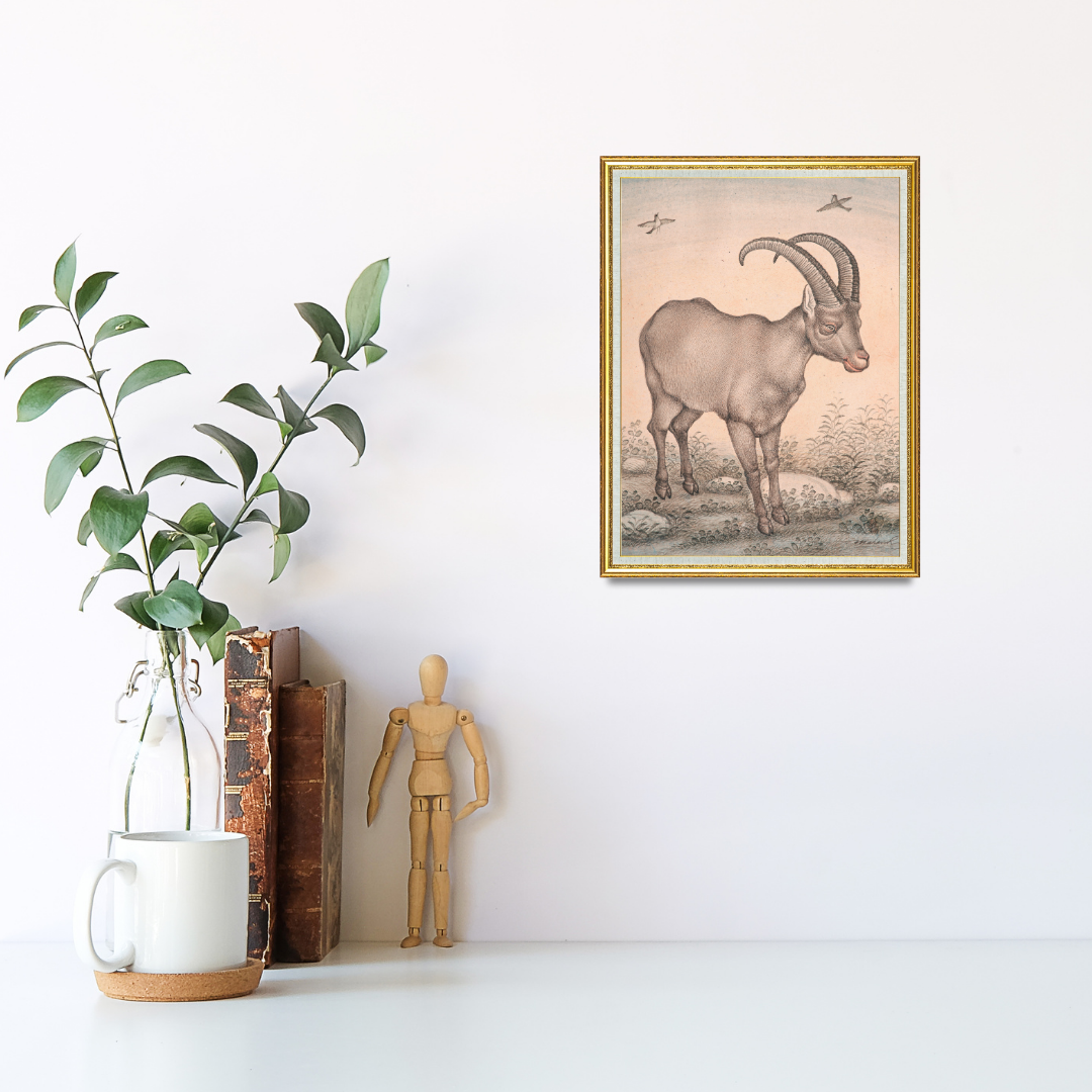 The goat stands on lightly detailed ground, surrounded by sprigs of foliage and scattered stones. Two birds circle in the pale sky, adding quiet movement above the steady pose. The old handmade paper softens the entire scene, giving the ink strokes a calm, weathered harmony.