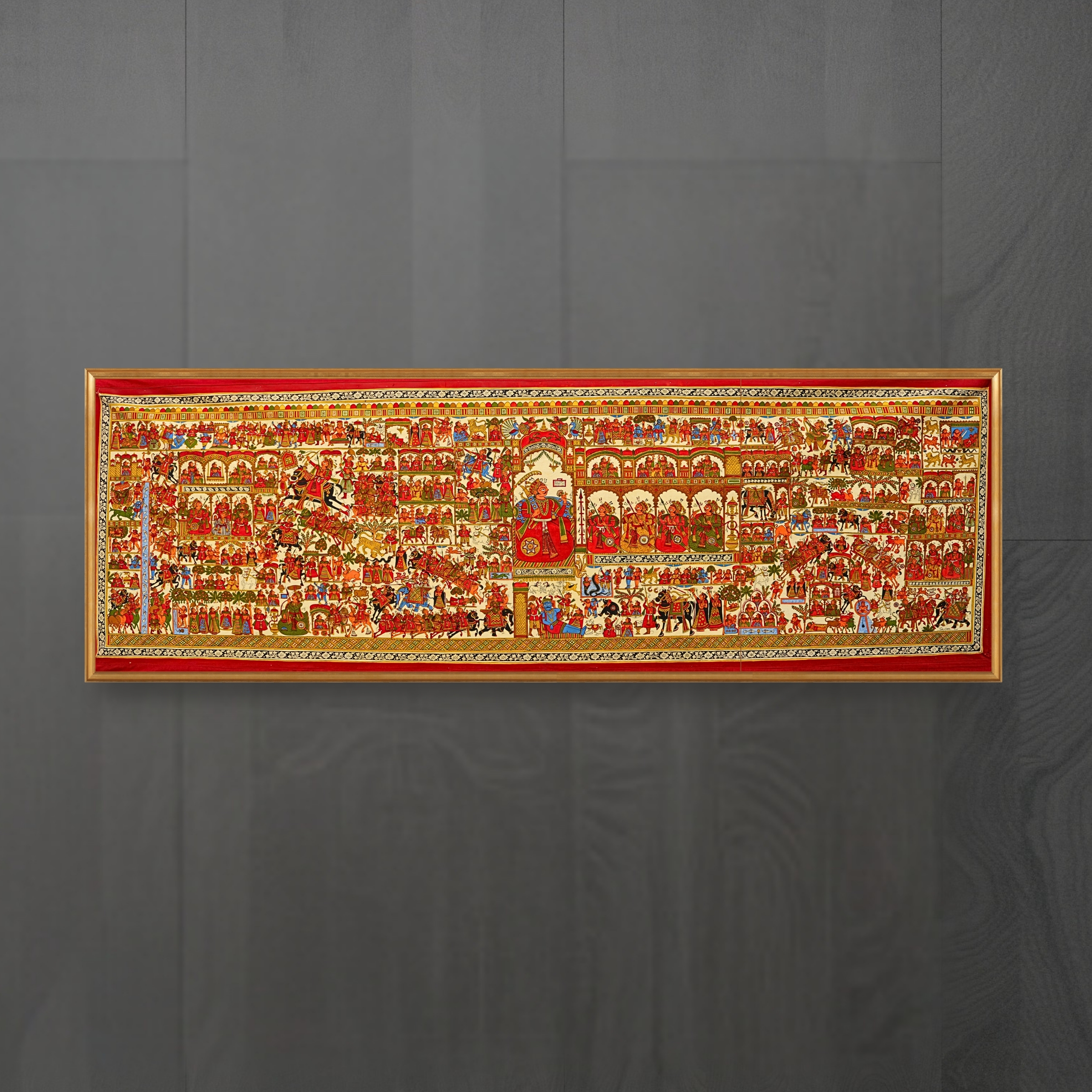 A central theme involves Pabu ji fulfilling a promise made at his niece Kelam's wedding to provide camels as a gift. Much like Lord Rama sent Hanuman to find Sita, Pabu ji dispatches his trusted aide, Harmal, to Lankeya (in modern-day Pakistan) to locate the animals. The painting illustrates the strategic mission to retrieve the camels, the romantic union with Princess Phulwanti in Soda, and the ultimate sacrifice where Pabu ji achieves martyrdom while defending a Charani woman’s cows.