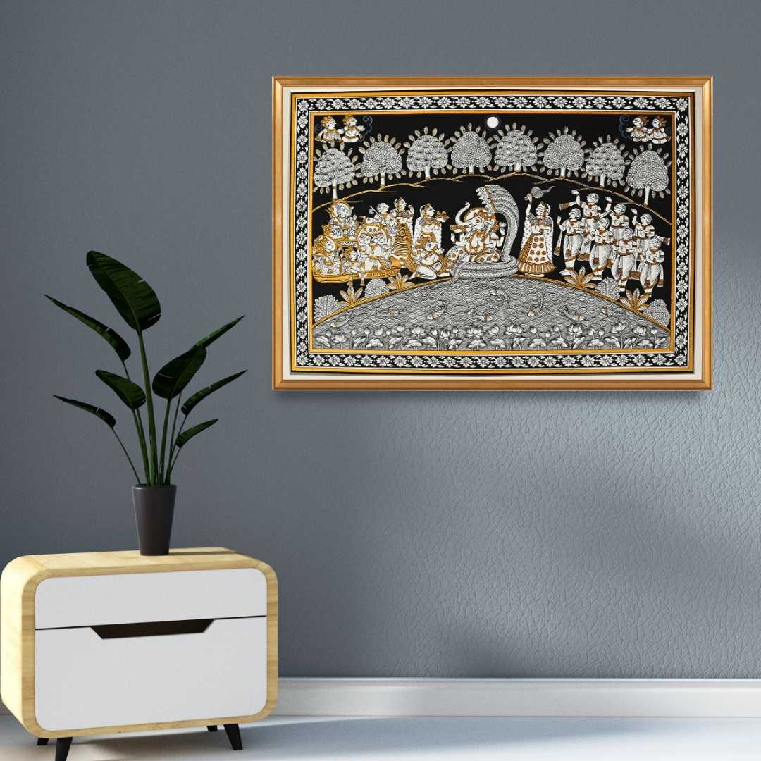 This artwork highlights Lord Ganesha as Vinayak, majestically seated atop the celestial serpent Sheshnag. He is flanked by Riddhi and Siddhi, who are shown performing ritual worship and waving ceremonial fans (Chauris). His vehicle, the Mooshak, is positioned in the foreground. Numerous deities, including Brahma, Vishnu, Shiva, Narad, and Lakshmi, descend from their respective realms to pay homage, while the Saptarishi stand reverently behind Ganesha, completing this grand divine assembly.