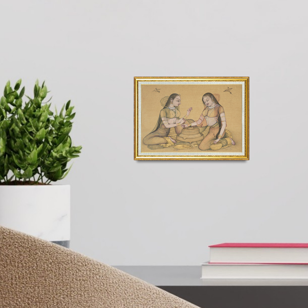 Golden Hearth by Mahaveer Swami captures a gentle domestic moment shared between two women as they grind wheat flour together. The scene feels warm and grounded, shaped by soft earthy tones and the measured elegance of miniature detailing. Their poised expressions, layered drapery and delicate jewellery create a sense of rhythm that mirrors the circular motion of the grinding stone.
