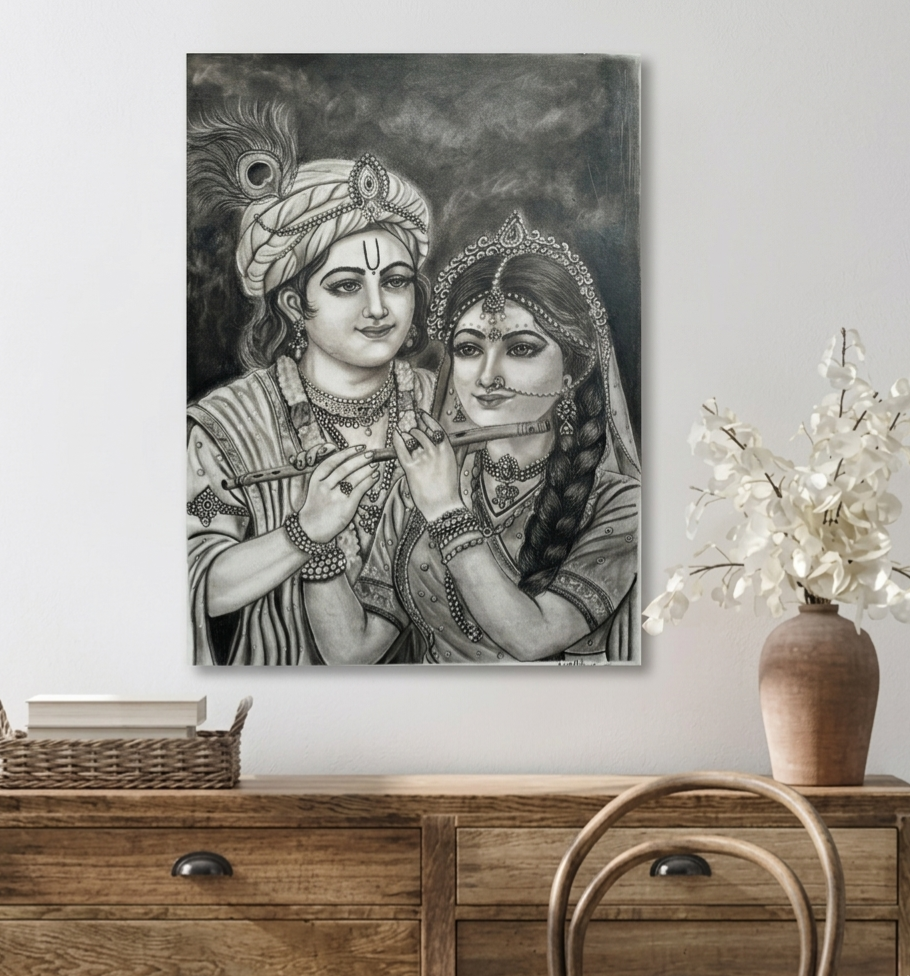 - The artwork reflects the timeless theme of divine love and harmony, central to Krishna–Radha traditions.