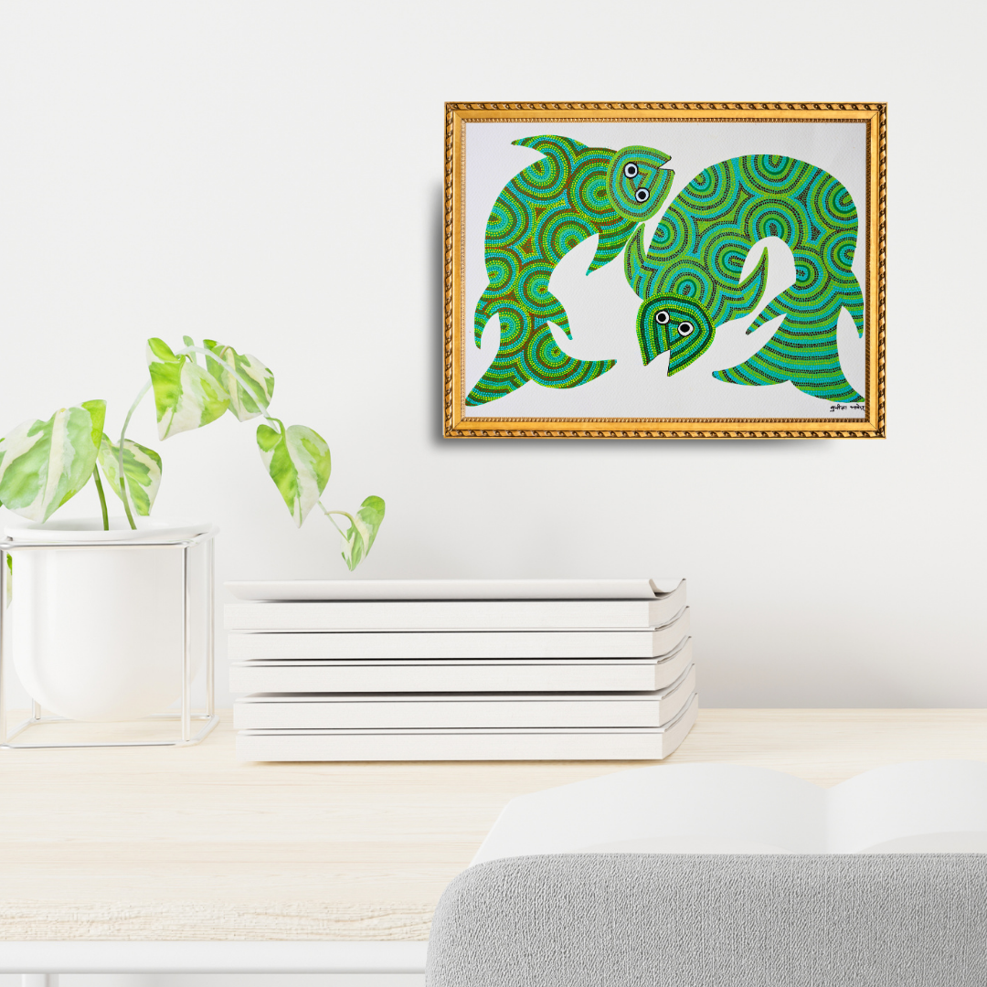 Elegant Depiction of Aquatic Life – The two graceful fish in bright green hues showcase a celebration of nature, making this artwork serene and visually engaging.