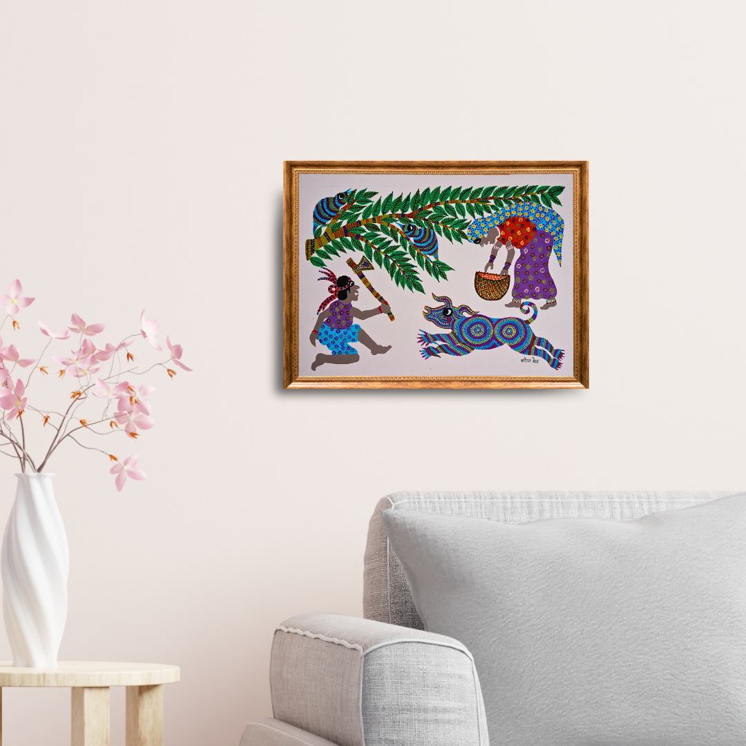 Narrative-driven art that captures the emotion of rural life gives a glance at tribal lives. Minimal yet emotionally rich composition fits both ethnic and modern interiors