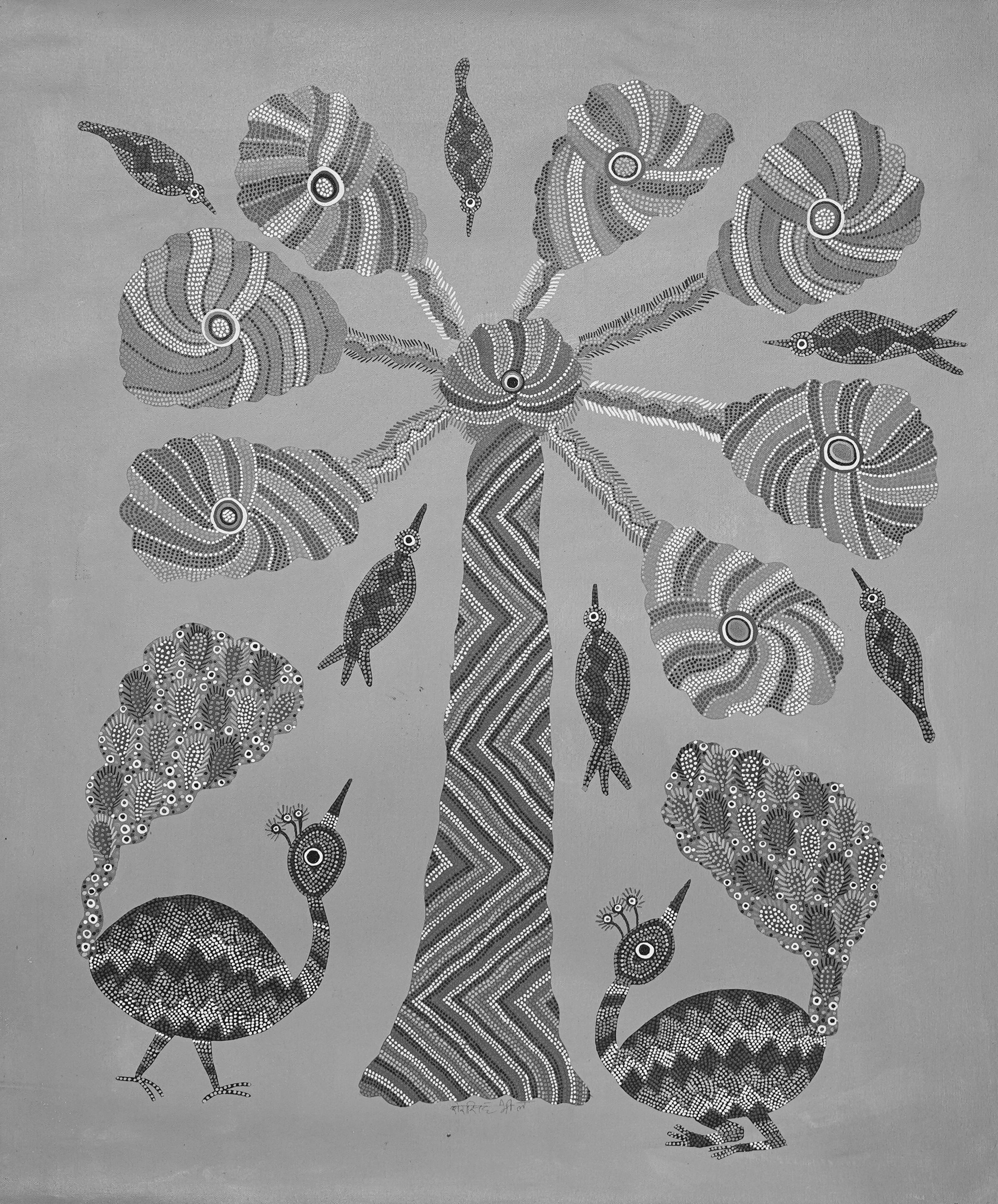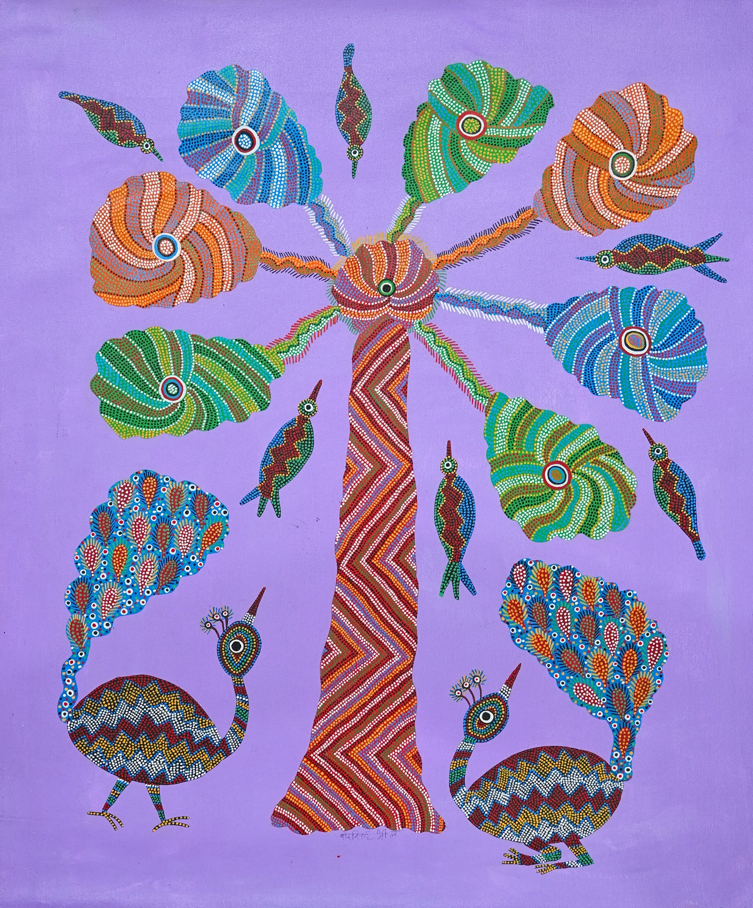 Executed in the traditional Bhil art style, the painting features dense dot patterns that give the forms their unique texture and vitality. These dots represent seeds of storytelling within Bhil culture, symbolizing life, growth, and continuity. Through his meticulous technique and vivid palette, Sher Singh Bhavor continues to preserve and celebrate the rich heritage of Bhil tribal art.