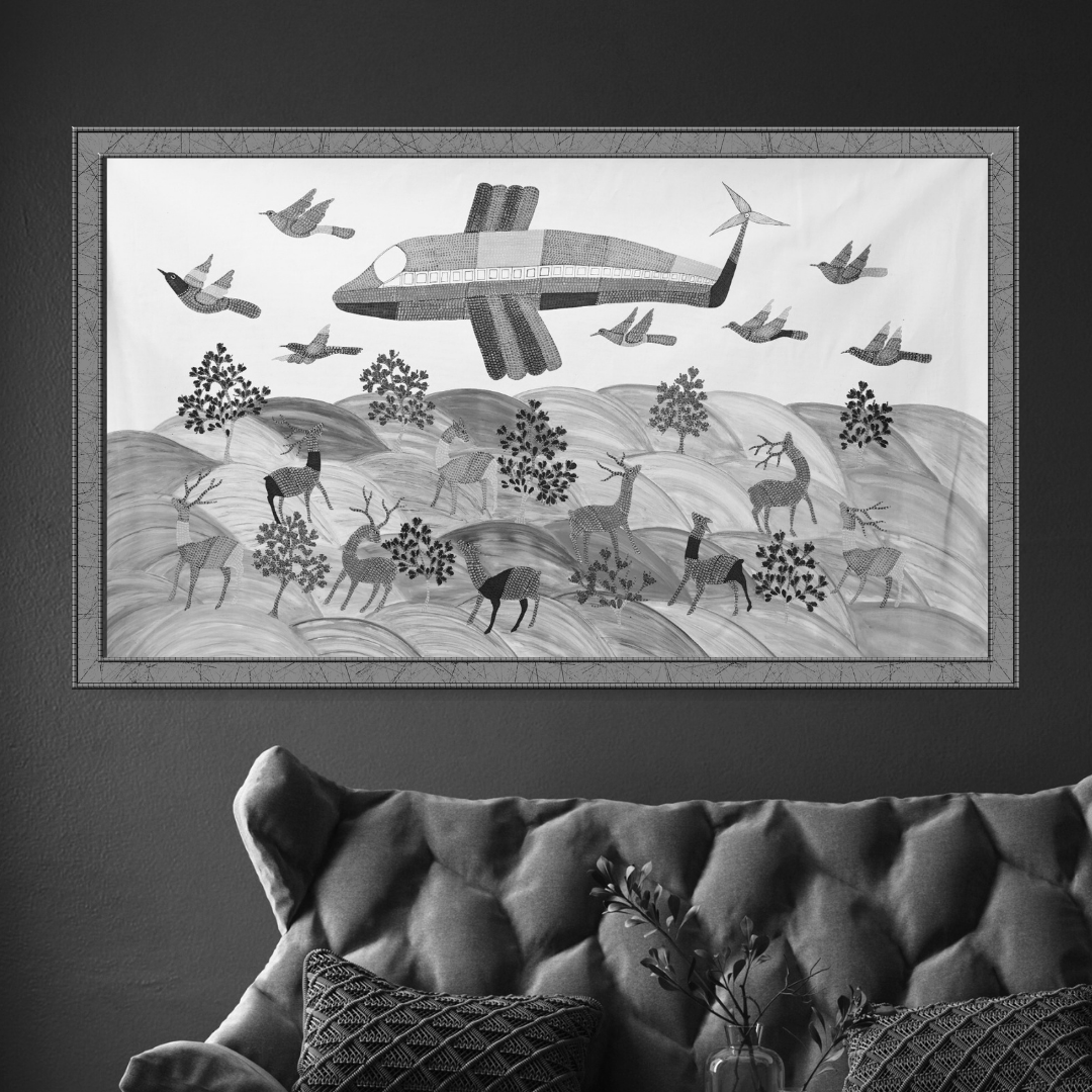 ‘Flight Over Forest’ is a captivating Gond artwork by renowned tribal artist Gariba Singh Tekam, celebrated for his storytelling through traditional techniques. In this piece, an airplane soars above a dense forest, with birds flying alongside in harmonious motion. Below, the land unfolds into a scenic tapestry of mountains, trees, and a group of deer illustrating a striking contrast between modernity and nature. With this thoughtful composition, the artist explores the theme of coexistence between two worlds.
