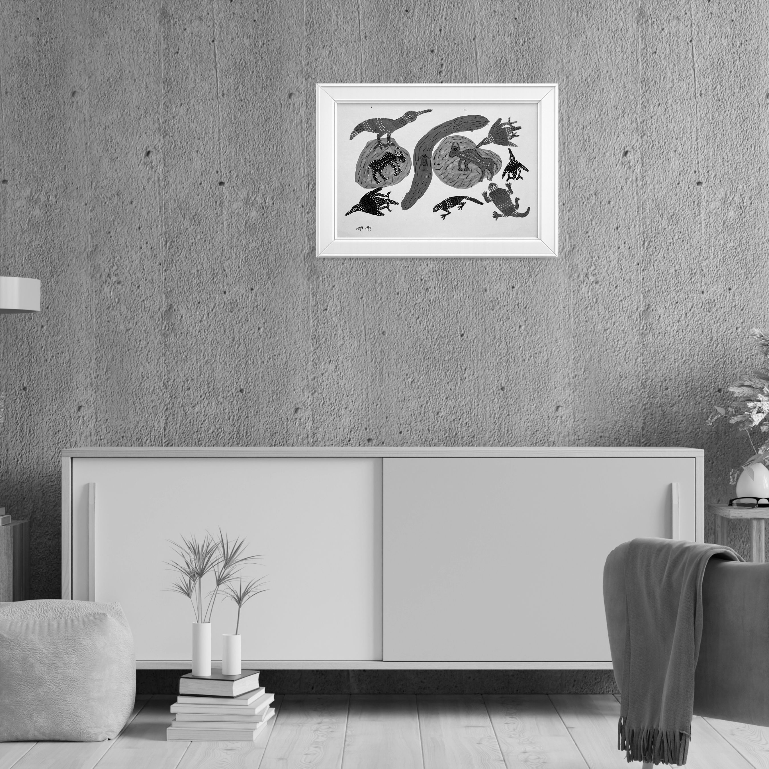 - The densely populated, multi-species composition showcases the Bhil vision of the natural world as an interconnected web of aquatic and terrestrial life.