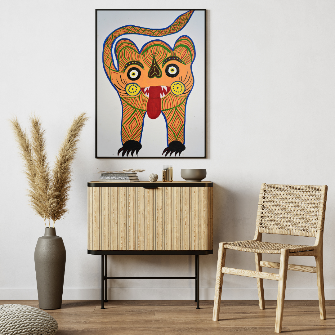 The painting has detailing of the tiger eyes, claws, and teeth are emphasized to convey both its ferocity and grace. Intense, wide eyes reflect the tiger power and alert, while sharp claws and teeth symbolize its predatory strength. At the same time, the sleek lines of the body and the fluidity of the pose highlight the tiger grace and agility, portraying it as both a fierce and majestic creature in the Baiga’s artistic expression.
