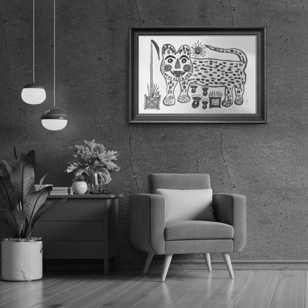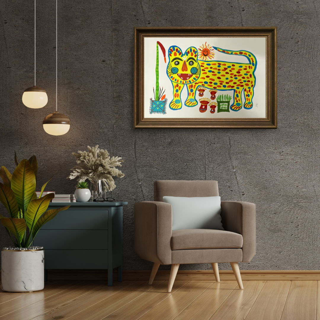 The depiction of Baghesur in Baiga art stands out for its vibrant colors, simplified forms, and symbolic significance, which are hallmarks of this artistic tradition. The bright yellow body, contrasting red stripes, and exaggerated facial features are consistent with Baiga representations of tigers, reflecting their unique style. Tigers, often imbued with spiritual and cultural importance, are a recurring motif in Baiga art, and the inclusion of surrounding elements like plants and mushrooms in the image of Baghesur likely holds symbolic meaning within the Baiga worldview.