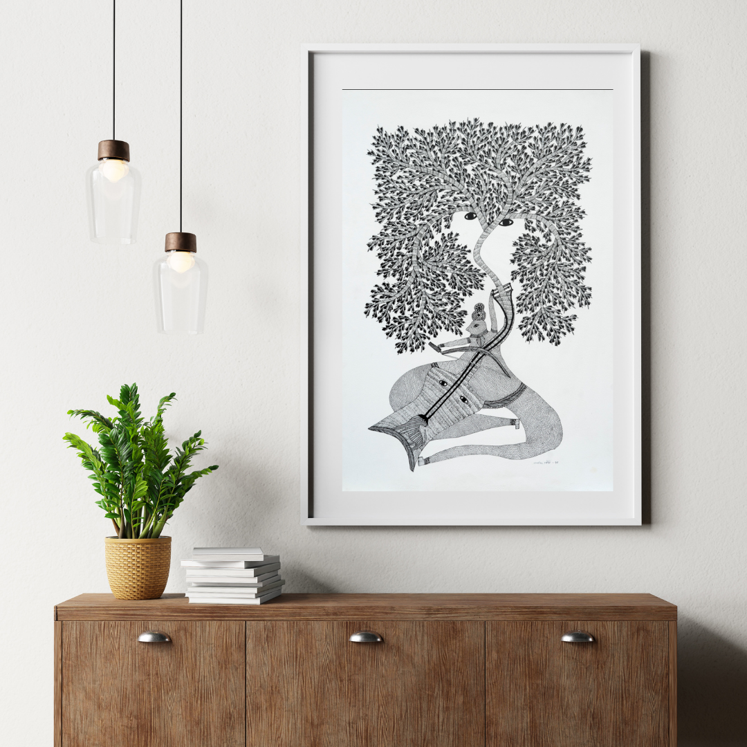 The visual elements of the artwork convey its message through the detailed use of lines, shapes, and a monochrome scheme. The lines create a feeling of movement and energy as they twist and connect, forming different parts of the composition and outlining the figures and objects. These lines not only shape the artwork but also give it life, showing a sense of connection. The shapes are mainly smooth and natural, with a tree-like figure in the center taking the lead. Its branches spread out like a canopy, and the rounded shapes within the tree suggest balance. The monochrome scheme simplifies the image, focusing attention on the lines' details and giving a feeling of timelessness. The absence of color highlights the texture add a depth of the work. The texture created by overlapping lines adds give the artwork movement and space. The arrangement of figures, with those in the front appearing closer and those in the back appearing farther away, creates a three-dimensional effect and adds depth. Through these visual elements, the artwork communicates ideas of life, connection, and timelessness.