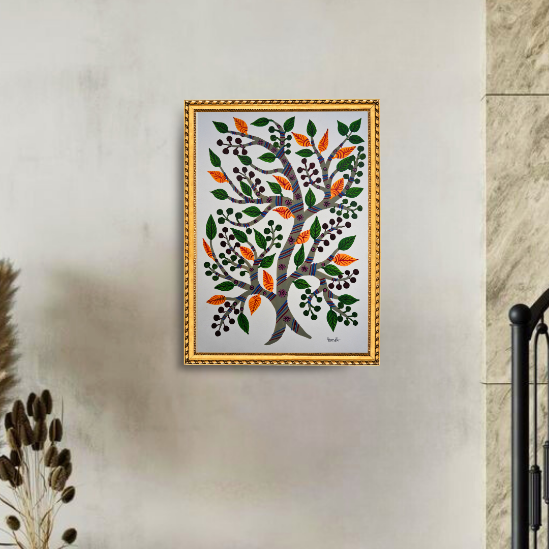 Hema Baiga's artwork beautifully illustrates the deep connection between the Baiga people, nature, and the spiritual world. In Baiga tradition, trees are more than just elements of the environment; they symbolize nourishment, protection, and a link to the divine. The Ber Ka Ped tree is particularly significant as its fruit provides food, and its presence in rituals ties it to ancestral spirits and natural forces. This tree embodies the Baiga belief in the balance between the physical and spiritual realms. Nature serves as a bridge, facilitating the flow of energy and blessings from the unseen world. Through intricate patterns and earthy colors, the artist emphasizes this profound relationship, demonstrating how trees like the Ber Ka Ped sustain both life and faith. This artwork reminds us that nature is not merely a resource but also a source of wisdom, guidance, and spiritual strength.