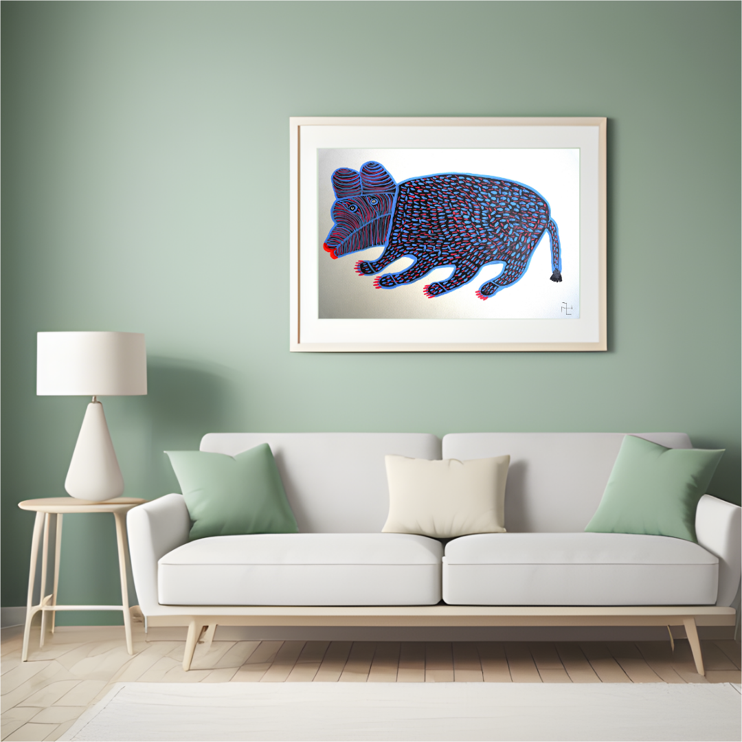The artwork depicts a Bhallu using a vibrant approach. The artist has employed bold lines and vivid colors to create a sense of movement and energy within the piece. The use of dark outlines against a light background emphasizes the bear's form and creates a sense of depth. The texture is achieved through the repetitive application of small, curved lines, which mimic the bear's fur and add a tactile quality to the artwork. The contrasting colors, such as the bright blue and red against the dark black, further enhance the visual impact and draw attention to the bear's features. Overall, the combination of these elements results in a dynamic and engaging representation of the Bhallu, capturing its essence in a unique and expressive manner. 16000