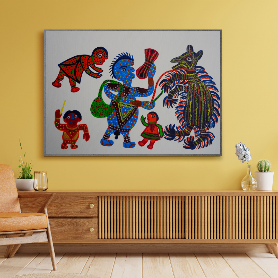 The artist personal experiences influenced the composition by reflecting a deep understanding of traditional street performances, such as the madari (performer) and bear act. The portrayal of this interaction may draw from the artist’s own observations of cultural practices, capturing the dynamics of human and animal relationships and the themes of entertainment and control.