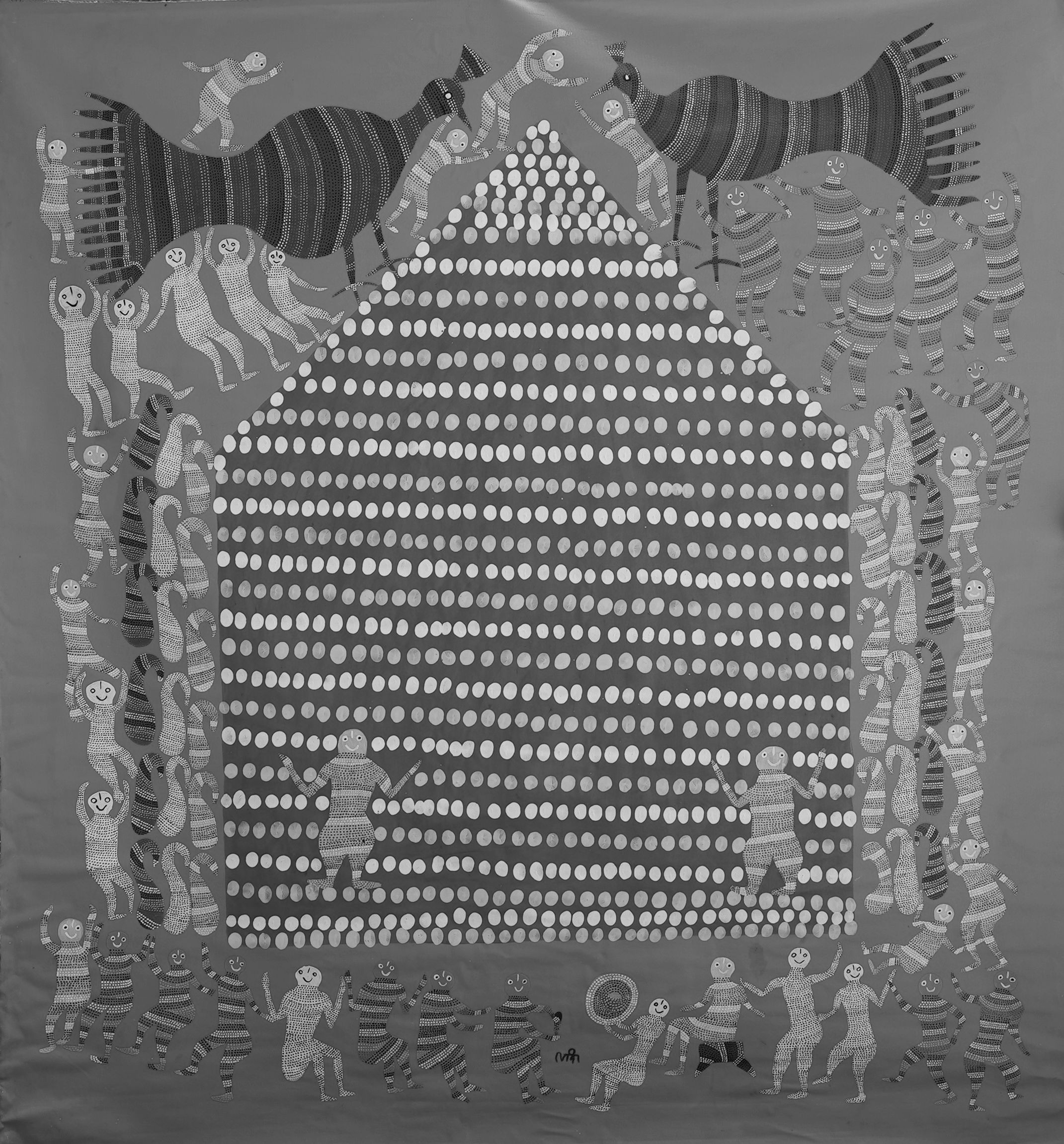 Lado Bai’s work is characterized by the dominance of animism and nature based themes. Spirituality, local traditions and rituals also find their place in her larger than life compositions. Elements of community, environment and strong sense of individualism blend together in harmonious, bold shades, replete with thousands of dots - an essential element of Bhil paintings. However, unlike other paintings these dots play a special role in setting Lado Bai’s work apart i.e. these dots set in a wave like or zig-zag manner give the illusion of movement. In Lado bai’s paintings, figures, birds and animals seem to be flying, moving and being life-like on canvas!