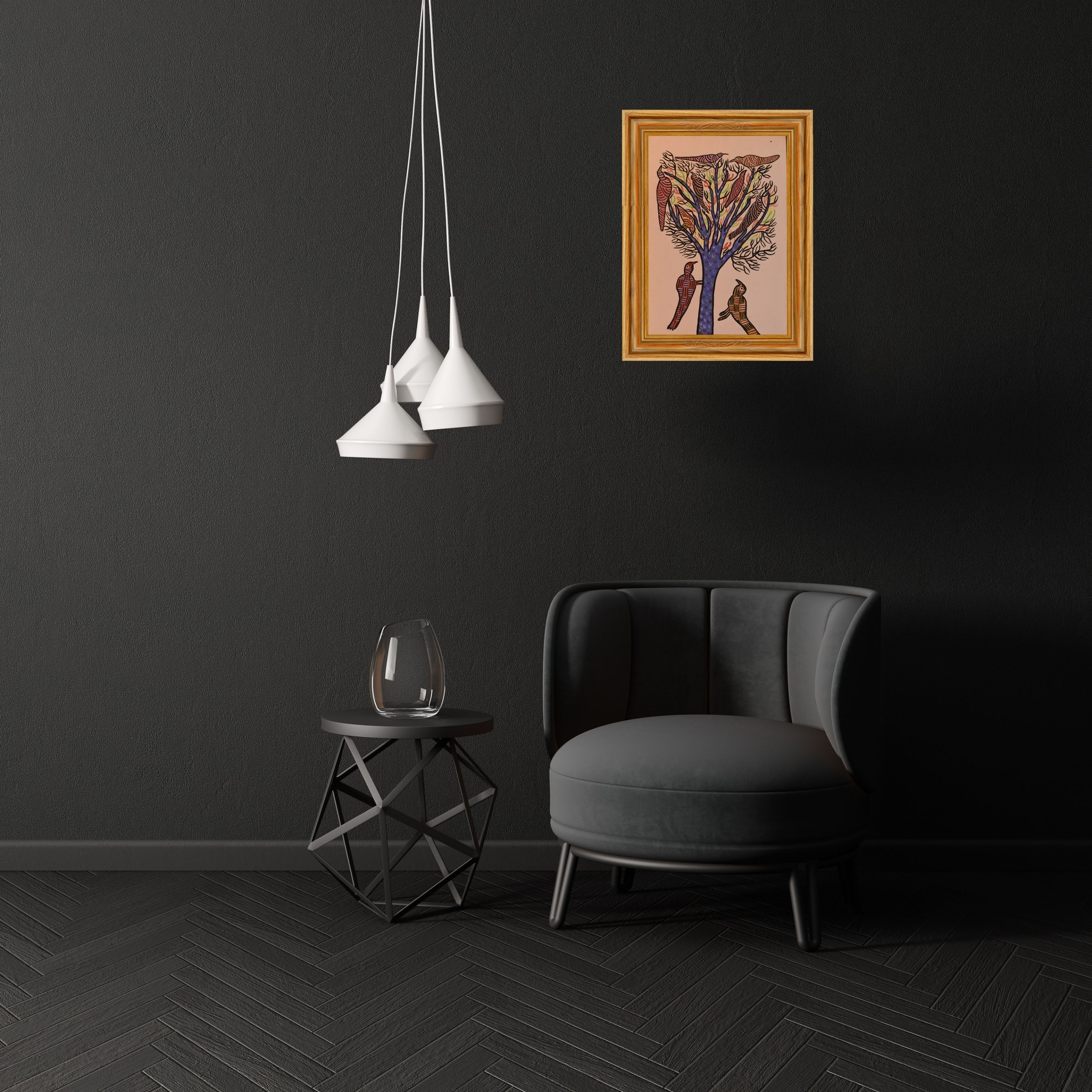 The cool blue of the trunk against the warm pinks and browns of the birds creates a colour harmony that is gentle and inviting, the muted tones giving this original artwork a quality of quiet refinement that distinguishes it from more intensely chromatic tribal art. Kala Bai Shyam's fine line work builds every surface with a patience and consistency that is the hallmark of the Gond tradition, the rippled patterns on the birds and the delicate leaf marks on the trunk each drawn individually by hand. As a piece of handcrafted Indian art, every branch, bird and leaf was created entirely by hand, carrying the irreplaceable warmth and authenticity of the truly handmade. This painting holds beautiful appeal as distinctive wall art for contemporary home decor and as a collectible of enduring cultural significance within the Gond tribal painting tradition, available on Rooftop.