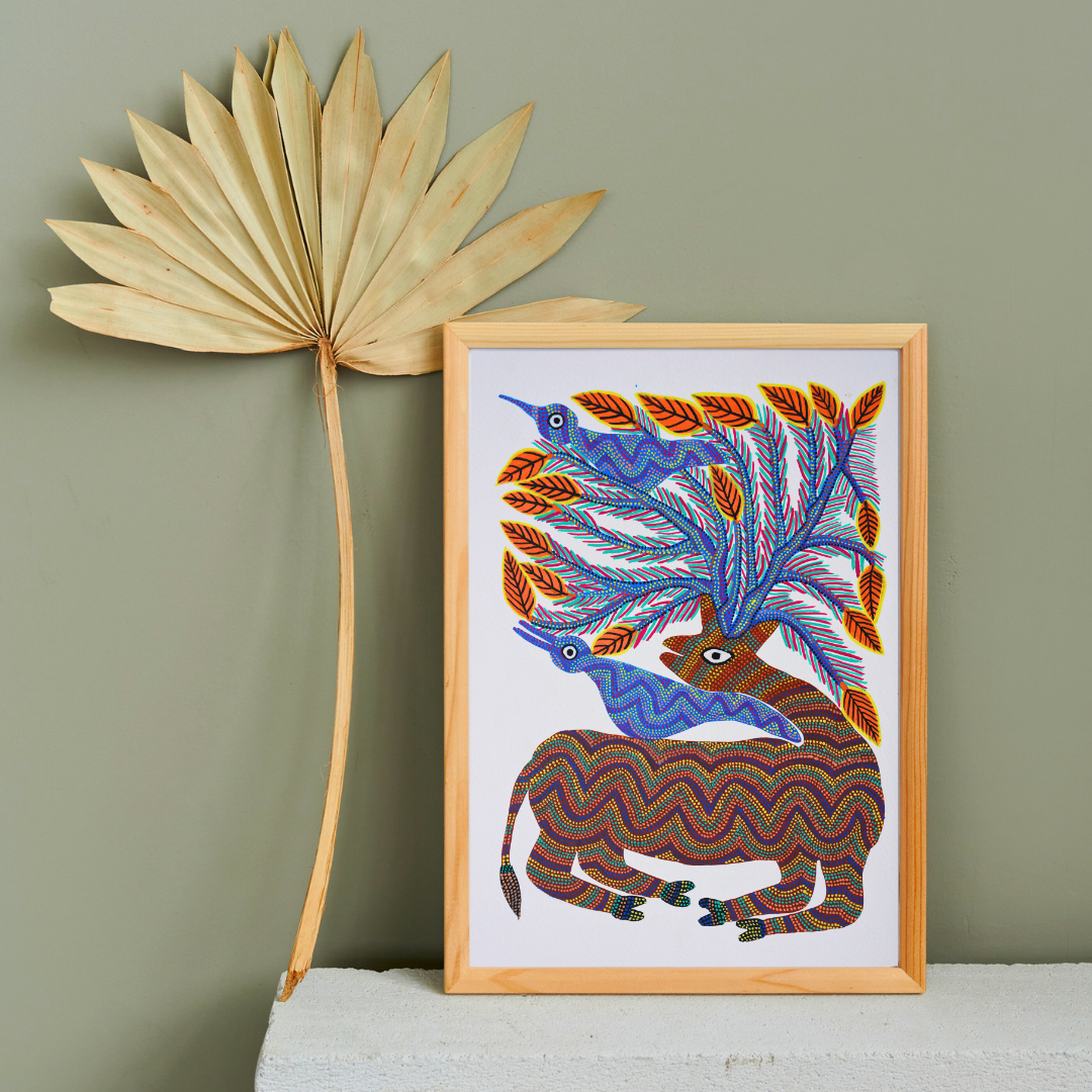 Birds on Barasingha by Ramesh Katara is a stunning Bhil painting. It shows the deep trust and friendship found in nature. The artwork shows a majestic Barasingha deer resting under a lush tree. Birds perch gently on its back. This scene symbolizes harmony and coexistence among all living things. The vivid colors and flowing branches create a beautiful balance. They reflect the strong bond between animals and their environment. This artwork honors the beauty of nature's connections. It’s a lovely fit for any space.