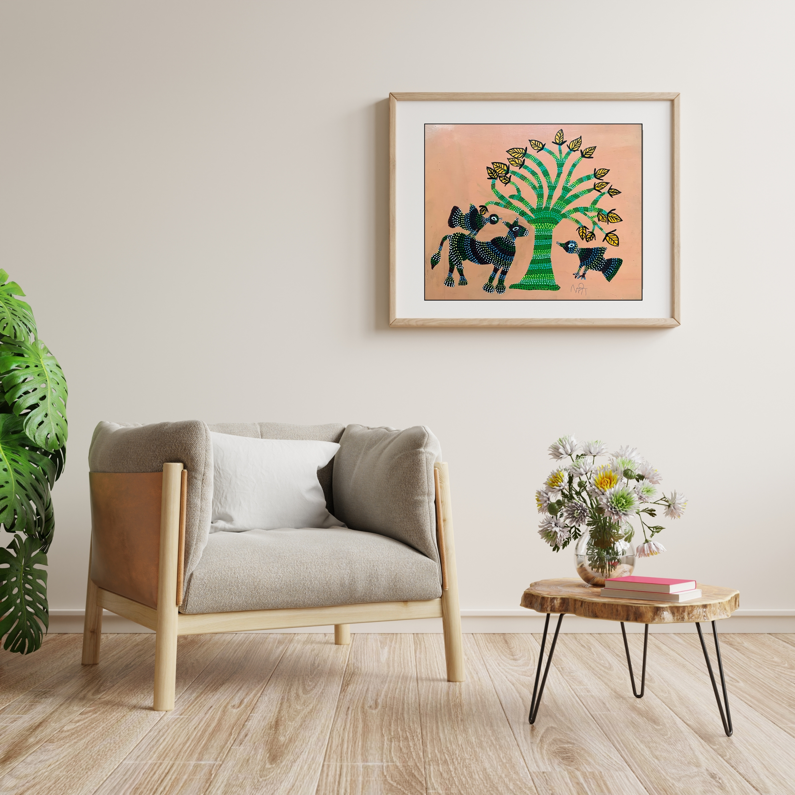 The contrast between the luminous green of the tree and the deep, dark bodies of the animals creates a visual richness that is at once bold and harmonious, the peach ground unifying every element within a single warm tonal field. Lado Bai's dot work is applied with characteristic patience across the animal forms, each mark placed by hand to build texture, depth and a shimmering quality of surface that no printed reproduction can capture. As an original artwork and a piece of handcrafted Indian art, this painting carries the irreplaceable warmth and individuality of the truly handmade. It functions beautifully as distinctive wall art for contemporary home decor and stands as a collectible of enduring cultural significance, rooted in the living traditions of Bhil tribal painting, available exclusively on Rooftop.
