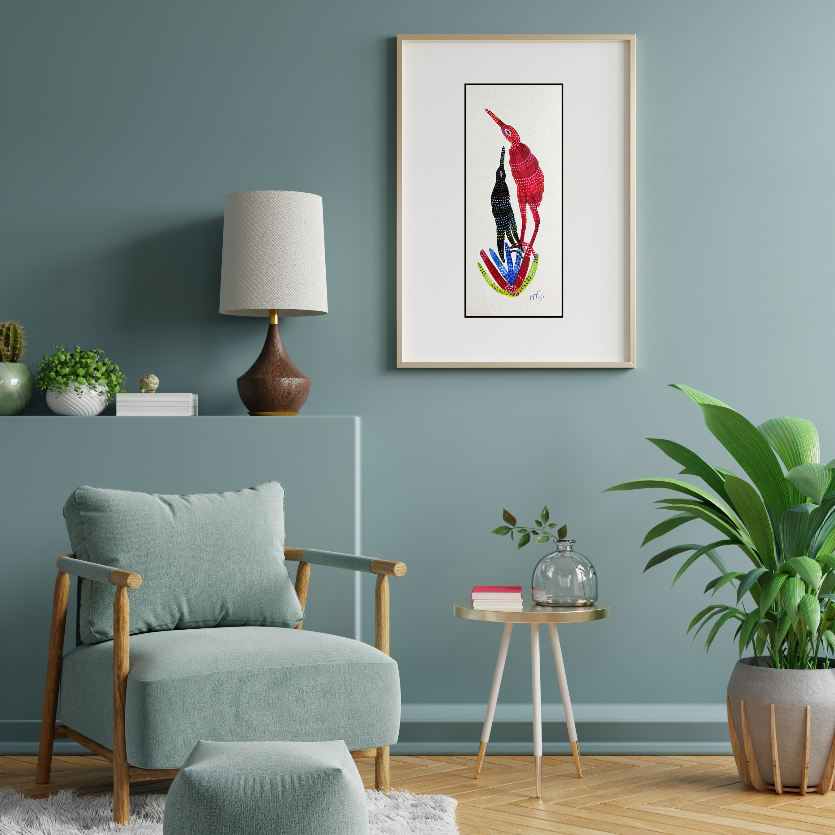 Two birds stretch across this handmade painting by Lado Bai, their elongated bodies locked together in a single sweeping horizontal gesture. The larger bird is rendered in deep black and olive, its surface alive with dots in white, cyan and yellow green, while the second bird blazes in crimson and magenta, its plump body tapering into a sharp beak at one end. At the opposite end, their shared tail fans out in vivid stripes of yellow, red and blue, each feather individually patterned with Lado Bai's meticulous dot work. Painted in acrylic on paper, the composition reads as a single creature split into two temperaments, two colours, two energies bound together by the logic of Bhil cosmology where separateness is never quite what it seems.