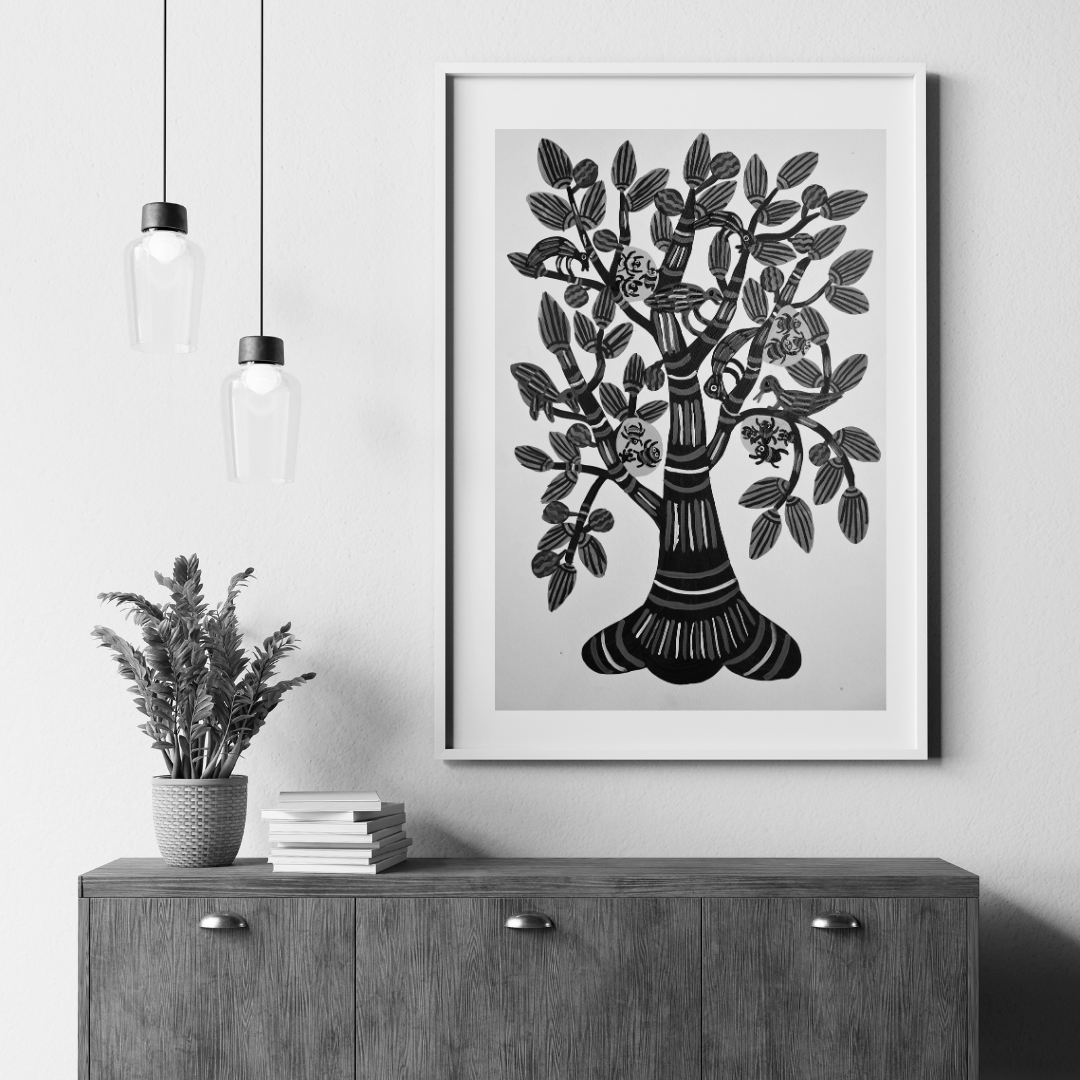 The tree reflects the Baiga tribe connection to nature by symbolizing the forest importance as a source of sustenance and spiritual significance. The depiction of the tree alongside bees a harmonious relationship with the world, where every element plays a vital role in the tribe survival and cultural practices.