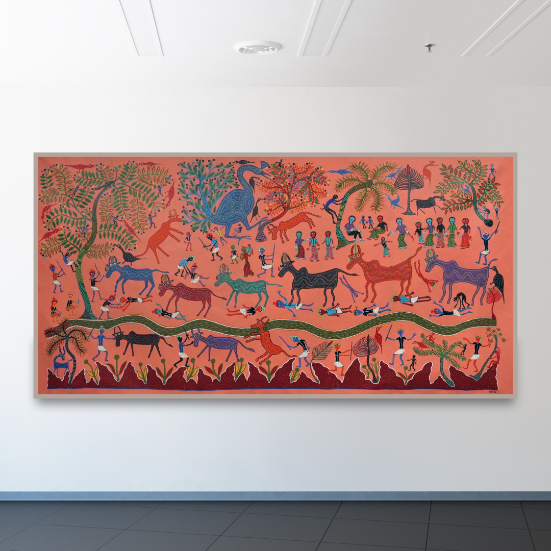 Whether placed in a living room, gallery wall, or a studio space, this unique 64.6 x 121-inch artwork invites viewers into the vibrant narrative world of tribal India.