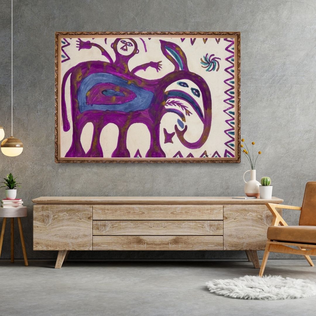 Child and Elephant Spirit by Malo Devi, a 2003 Sohrai painting, depicts a childlike figure riding a large elephant-like creature, rendered in deep purples and blues. Malo Devi blends innocence with symbolism, turning a familiar village motif into a reflection of companionship and protection. The child’s outstretched arms echo themes of trust and belonging, while the animal’s curved form suggests strength rooted in gentleness.