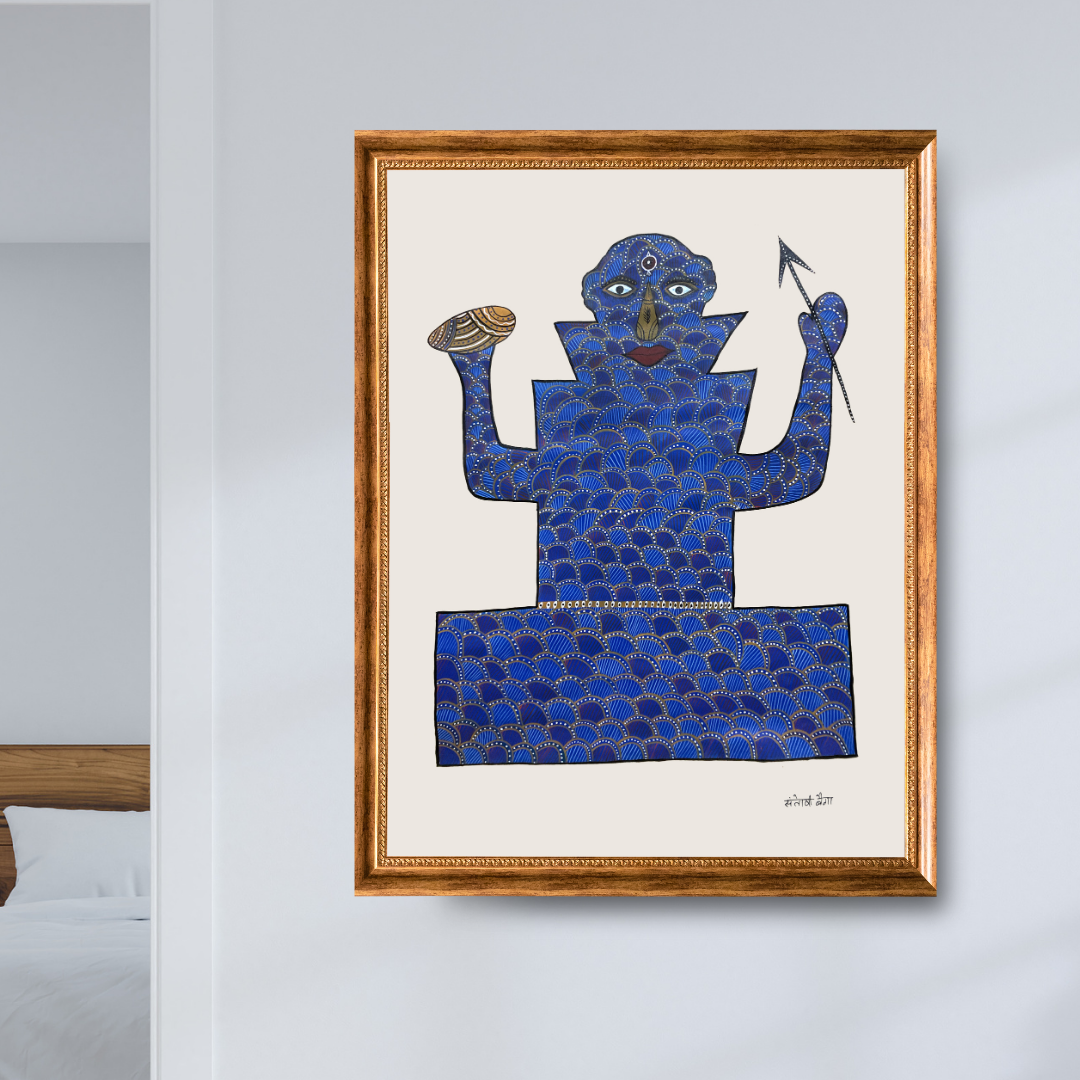 The composition of the artwork significantly contributes to the sense of divinity associated with Chora Dev. Positioned centrally and dominating the space, Chora Dev's placement immediately commands attention, emphasizing his importance and power. The symmetrical arrangement of his figure, with arms raised and holding symbolic objects, creates a sense of balance and order, qualities often linked to divine beings. The use of geometric shapes, such as the rectangular base and triangular head, reinforces a feeling of structure and stability, echoing themes of permanence and divinity commonly found in religious art and architecture. The predominant use of blue, a color widely associated with spirituality and the sacred across cultures, further enhances Chora Dev's divine aura. His large, prominent eyes, gazing directly at the viewer, establish a powerful connection, evoking a sense of watchfulness and an all-seeing presence. The objects he holds, such as the arrow and the item in his left hand, likely carry symbolic significance that underscores his divine attributes, enriching the overall sacred essence of the composition.