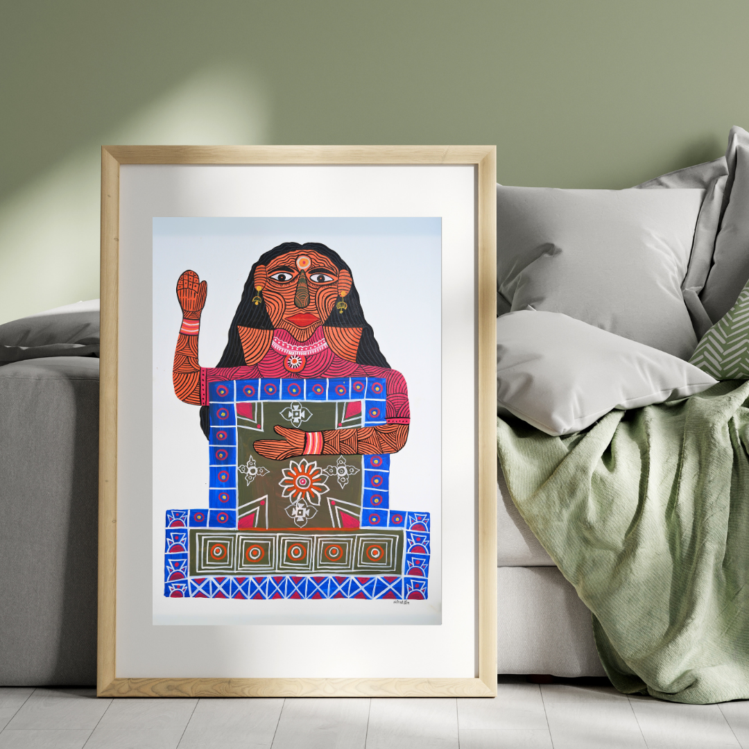 The artwork can be seen very differently depending on who is looking at it. For an outsider, unfamiliar with the Baiga culture, the artwork might simply appear as a colorful, geometric design of a woman with a raised hand. The bright colors and shapes may seem interesting or beautiful, but without understanding the cultural meaning, the deeper significance would be missed. On the other hand, for a Baiga community member, the artwork holds deep religious and cultural meaning. The figure is likely a depiction of Chora Devi, a goddess who represents healing, protection, and fertility. The raised hand in the artwork is a symbol of blessings, and the intricate patterns and colors are seen as representing sacred energy and the goddess’s power. This difference in interpretation shows how important cultural knowledge is to understanding art. While an outsider may only see a nice design, for the Baiga community, the artwork connects them to their beliefs and traditions, making it a powerful symbol of their spiritual world.