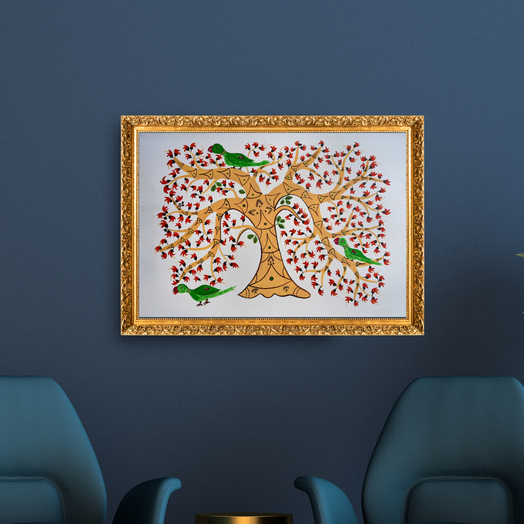 Chulla Ka Ped and Tota: A Sacred Connection in Baiga Culture is an important symbol in Baiga culture, representing their deep connection with their ancestors and nature. The roots of the tree stand for the past, the trunk symbolizes the present, and the branches and leaves represent the future. The tota, or parrot, is often shown on the Chulla Ka Ped. It is believed to act as a messenger between the living and the dead, carrying prayers and offerings to the ancestors. The parrot is also seen as a sign of rebirth and renewal, symbolizing the soul's journey. Together, the Chulla Ka Ped and the tota play a key role in Baiga spirituality and are used in rituals to connect with the spiritual world.