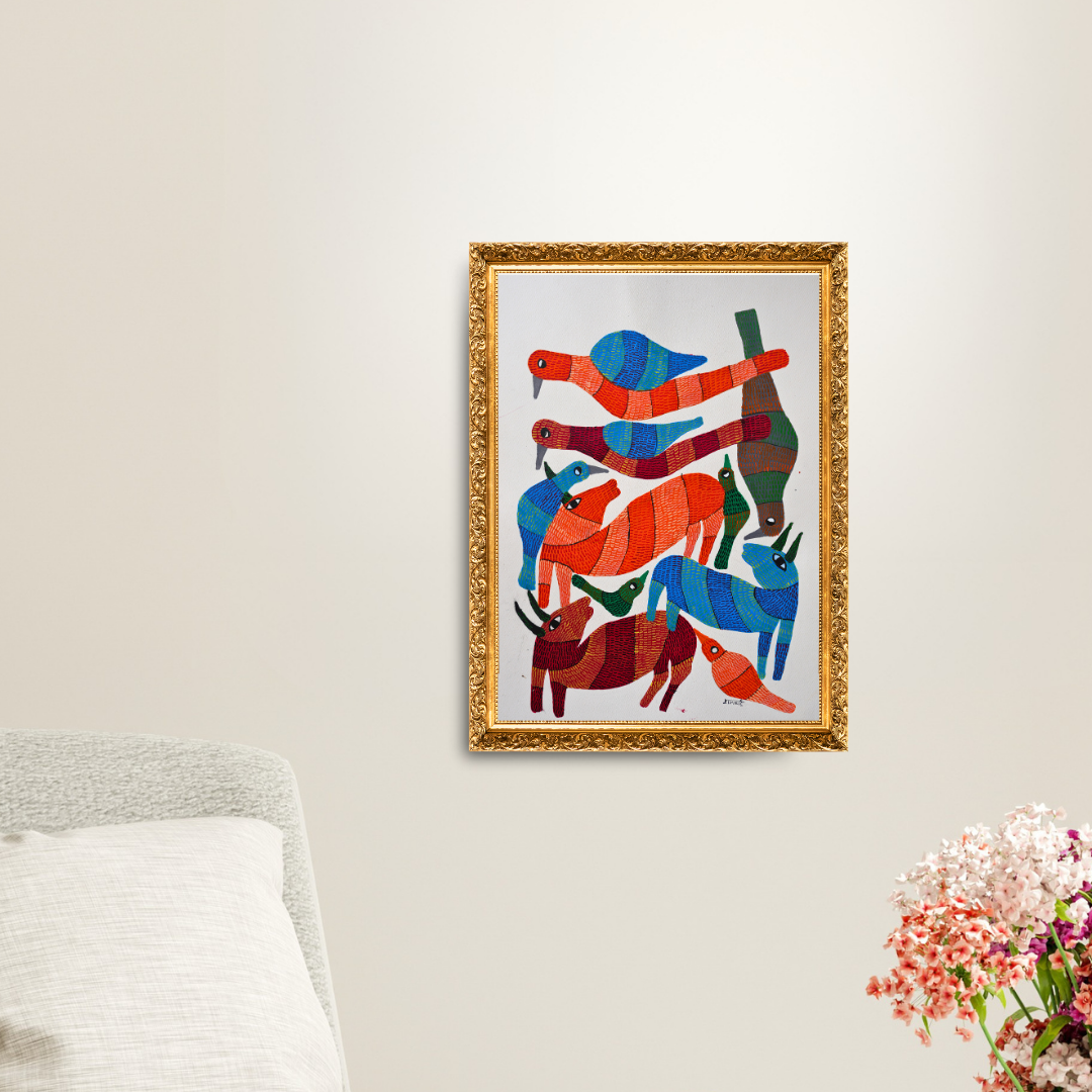Gond tribal art is known for its vibrant storytelling through intricate lines, dots, and natural motifs. Practised by the Gondi people, it reflects their beliefs, folklore, and deep connection with nature. This painting also depicts a scene from the lives of the wildlife in a simple yet striking visual composition.