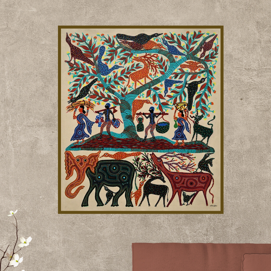 Painted by artist Anil Bariya, a celebrated Bhil artist known for his intricate storytelling through traditional tribal art. With deep cultural symbolism and a strong narrative, this piece beautifully reflects the essence of Bhil folklore and traditions. The artist's masterful use of patterns, textures, and colours makes this artwork a remarkable representation of tribal artistry and heritage. He depicts the animals at the bottom, on top of them are the humans who are engaged in their daily activities and above them are the birds in the tree, which is connected to the ground. This beautiful interconnection simply tells us that nature, wildlife and humans co-depend, co-exist in harmony and peace.
