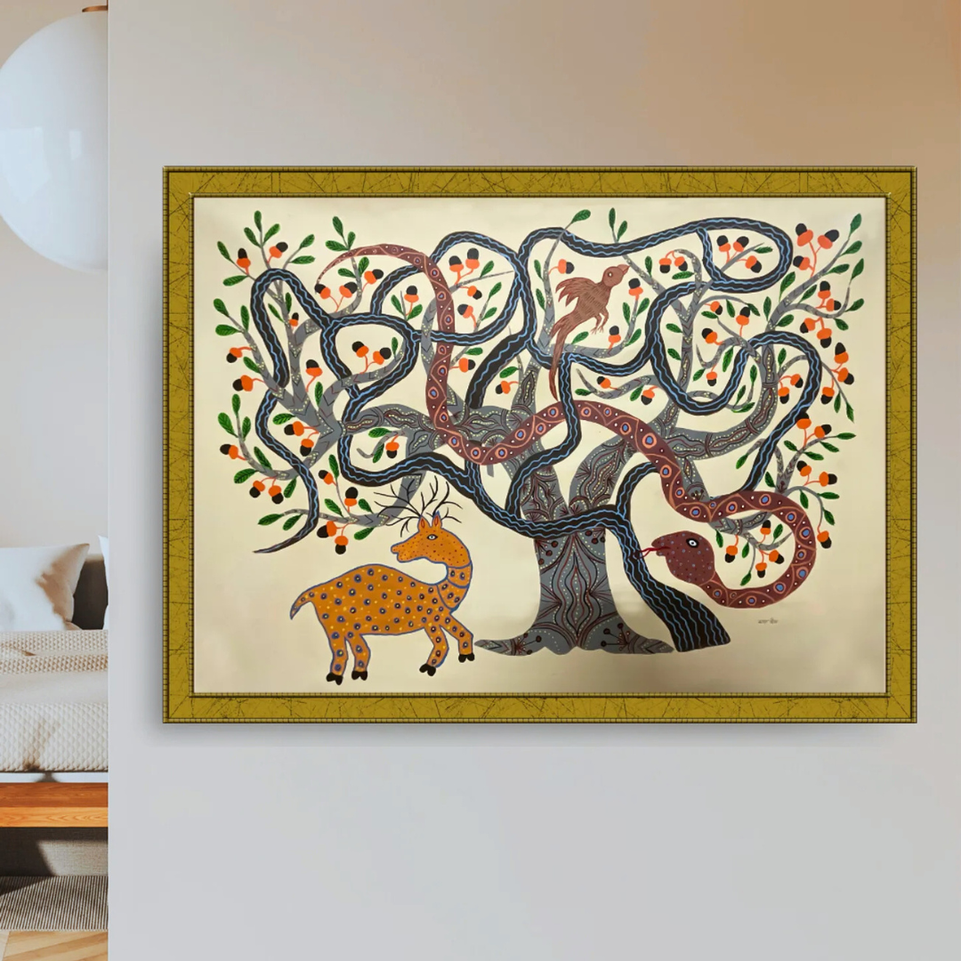 "Creatures of Baiga Under Wood Apple and Mistletoe Trees" by Roopa Bai beautifully captures a serene forest scene in the Baiga art style. The painting features a wood apple and mistletoe tree, under which a deer and a bull rest, while a snake coiled around its branches observes the scene. The artist uses these natural elements to illustrate the balance and harmony within nature. Each creature in the painting plays an essential role in the life cycle, reflecting the Baiga people's deep connection with their environment. The bull, deer, and snake symbolize survival, coexistence, and respect for the natural world. This artwork highlights the interconnectedness of all living beings, emphasizing the Baiga community's spiritual bond with nature. With intricate patterns and earthy colors, the artist brings this sacred connection to life, celebrating the beauty of the natural world and Baiga traditions.