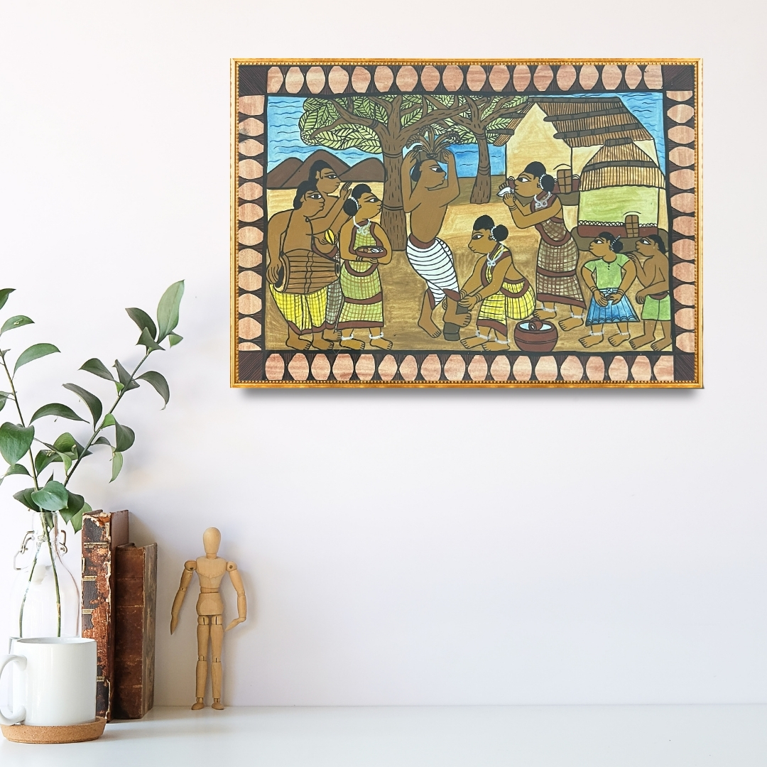 Working within the storytelling traditions of tribal and Paitkar folk art, Kishor Gayen transforms everyday practices into structured pictorial narratives. In acrylic on canvas or paper, he documents gestures of work, devotion and social exchange that define village existence. Daily Rituals XI becomes a reflection of cultural continuity, where the rhythms of daily life are preserved through colour, pattern and balanced composition.