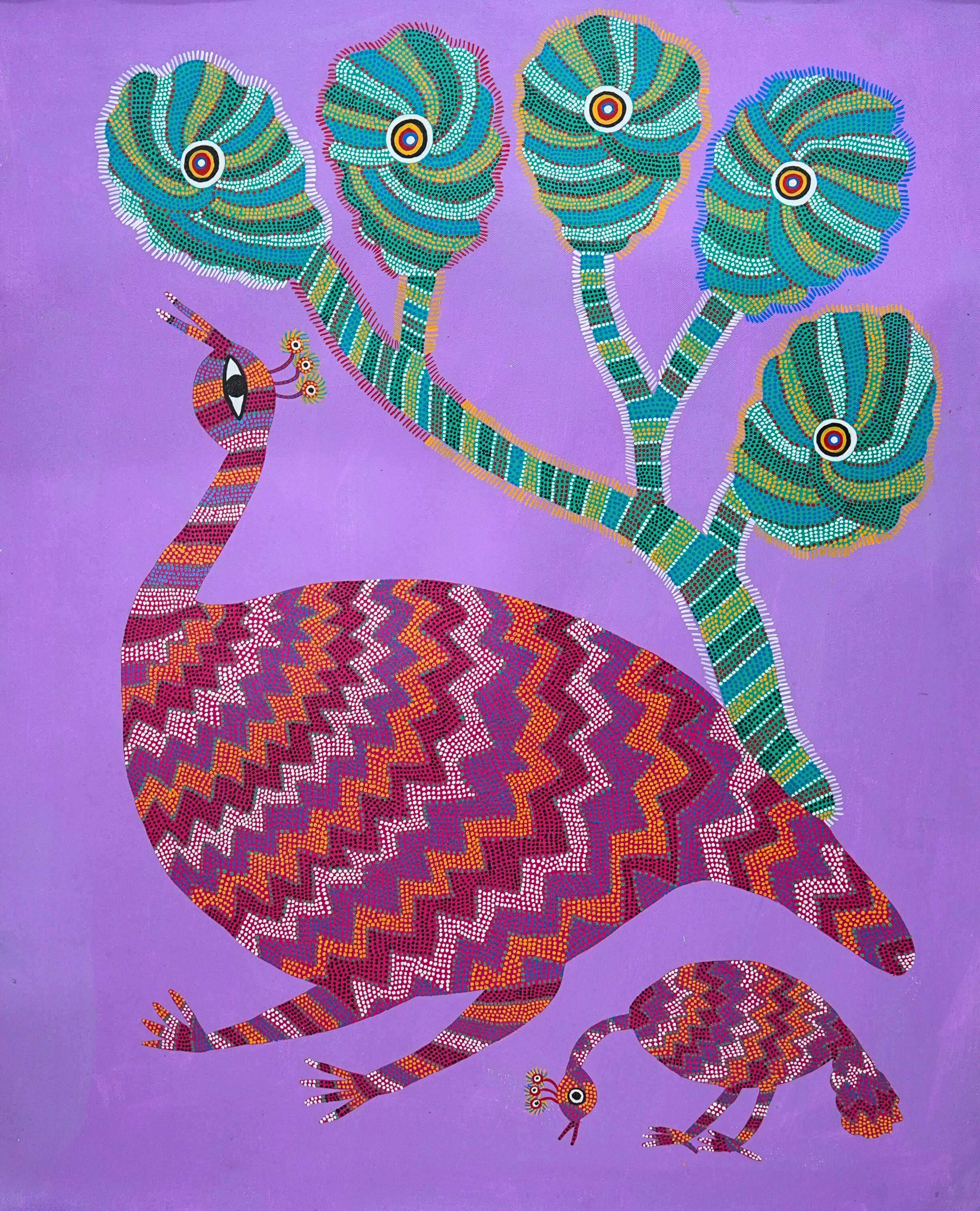 Each dot contributes to the narrative flow of the artwork, transforming the animal and surrounding environment into a vibrant tapestry. Sher Singh Bhavor’s work reflects the Bhil community’s deep respect for nature and their enduring storytelling traditions.