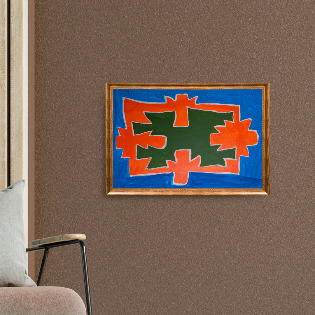 ‘Tribal Patterns of Dhignaa Rangoli’ by Ramrati Baiga is a striking and meaningful portrayal of the sacred Dhignaa motif, an important symbol in Baiga tribal tradition. This vibrant artwork blends dynamic geometric forms with bold colours, deep green, vivid orange, and bright blue to represent protection, balance, and the Baiga people’s deep spiritual bond with nature and the cosmos. The layered borders and angular shapes echo the tribe’s age-old beliefs in harmony, resilience, and cosmic order. A small swastika in the corner further reinforces the sacred energy and auspiciousness of the piece. With its powerful contemporary expression rooted in ancestral wisdom, this hand-painted work brings strength, positivity, and the essence of Baiga culture into any space.